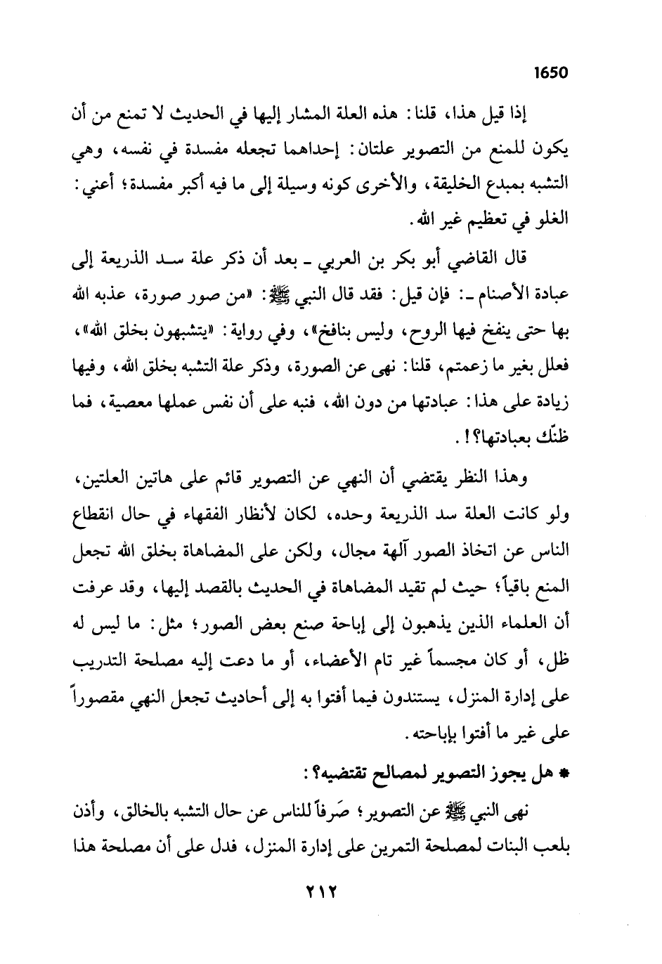 وهذا النظر يقتضي أن النهي عن التصوير قائم على هاتين العلتين، ولو كانت العلة سد الذريعة وحده، لكان لأنظار الفقهاء في حال انقطاع الناس عن اتخاذ الصور آلهة مجال، ولكن على المضاهاة بخلق الله تجعل المنع باقياً؛ حيث لم تقيد المضاهاة في الحديث بالقصد إليها، وقد عرفت أن العلماء الذين يذهبون إلى إباحة صنع بعض الصور؛ مثل: ما ليس له ظل، أو كان مجسماً غير تام الأعضاء، أو ما دعت إليه مصلحة التدريب على إدارة المنزل، يستندون فيما أفتوا به إلى أحاديث تجعل النهي مقصورًا على غير ما أفتوا لإباحته.