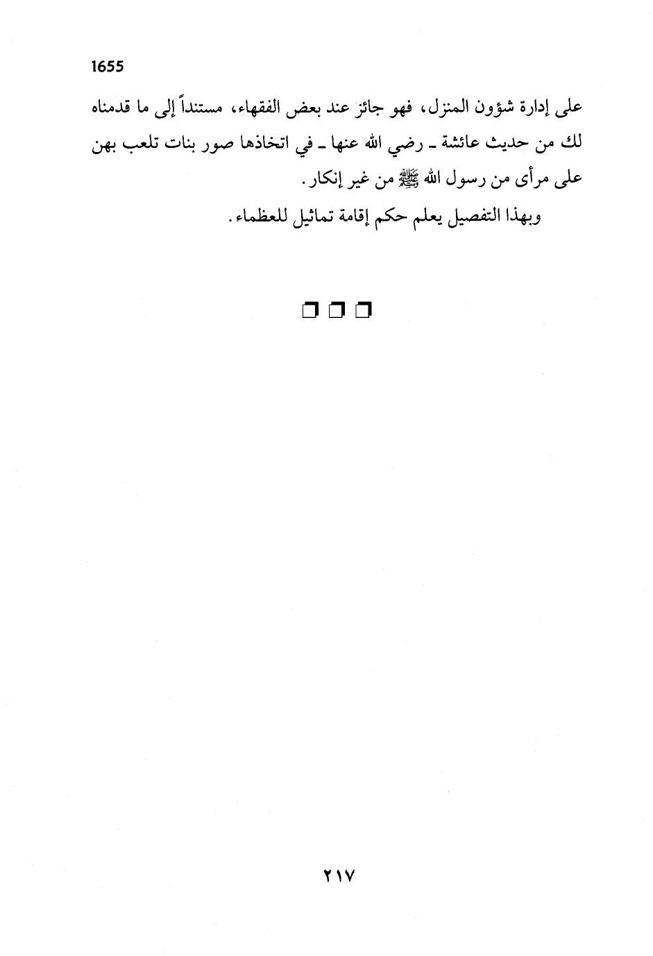 على إدارة شؤون المنزل، فهو جائز عند بعض الفقهاء، مستنداً إلى ما قدمناه لك من حديث عائشة - رضي الله عنها - في اتخاذها صور بنات تلعب بهن على مرأى من رسول الله - صلى الله عليه وسلم - من غير إنكار.