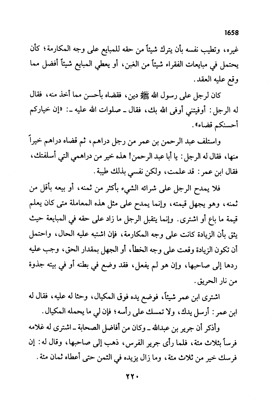 وأذكر أن جرير بن عبد الله - وكان من أفاضل الصحابة - اشترى له غلامه فرسًا بثلاث مئة، فلما رأى جرير الفرس، ذهب إلى صاحبها، وقال له: إن فرسك خير من ثلاث مئة، وما زال يزيده في الثمن حتى أعطاه ثمان مئة.