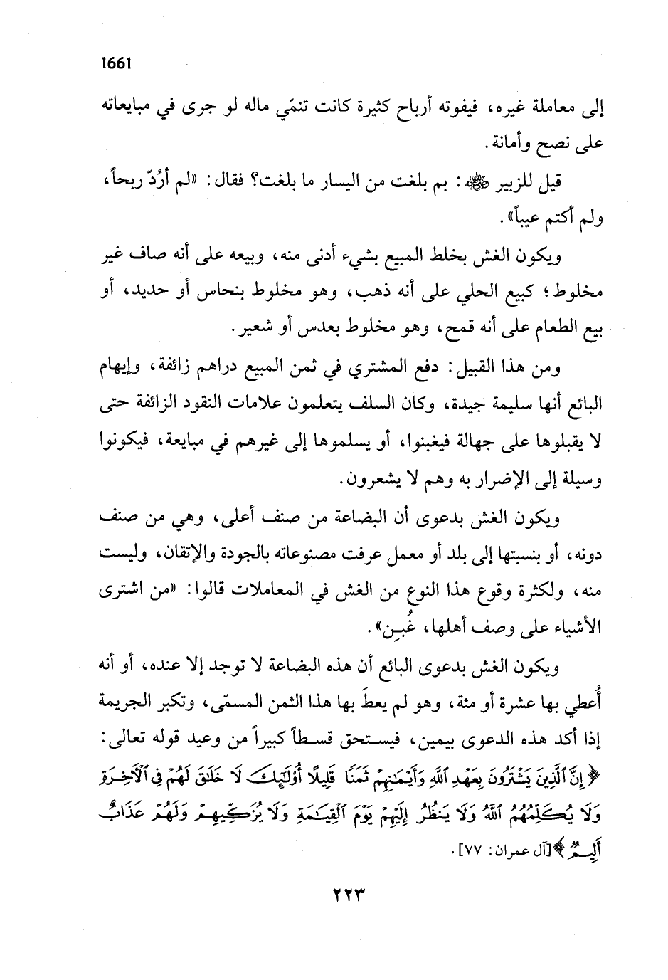 قيل للزبير - رضي الله عنه -: بلغت من اليسار ما بلغت؟ فقال: "لم أرُدّ ربحاً، ولم أكتم عيباً".