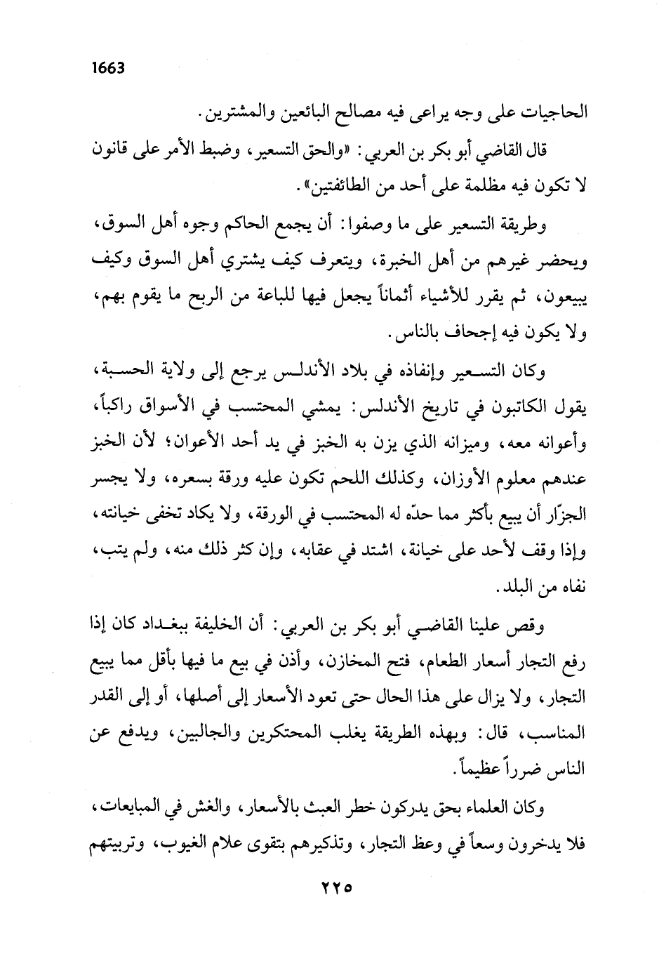 قال القاضي أبو بكر بن العربي: "والحق التسعير، وضبط الأمر على قانون لا تكون فيه مظلمة على أحد من الطائفتين".