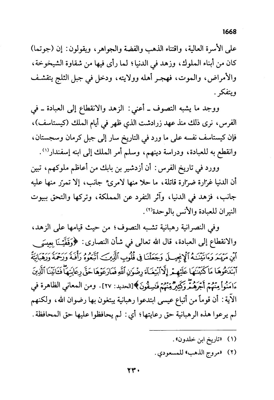 ووجد ما يشبه التصوف - أعني: الزهد والانقطاع إلى العبادة - في الفرس، نرى ذلك منذ عهد زرادشت الذي ظهر في أيام الملك (كيستاسف)، فإن كيستاسف نفسه على ما ورد في التاريخ سار إلى جبل كرمان وسجستان، وانقطع به للعبادة، ودراسة دينهم، وسلم أمر الملك إلى ابنه إسفندار (¬1).