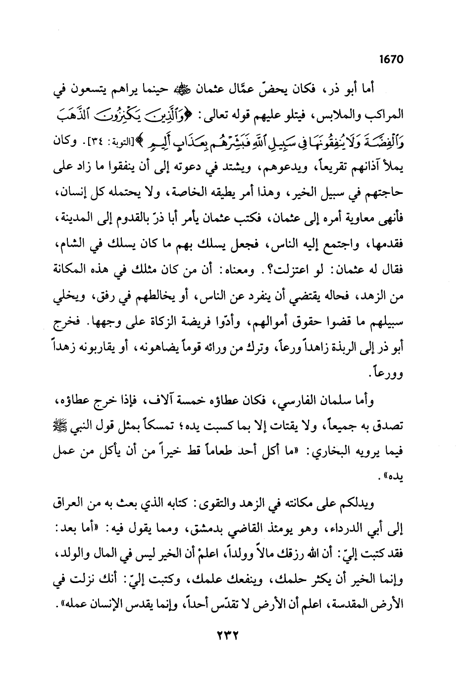 أما أبو ذر، فكان يحض عمَّال عثمان - رضي الله عنه - حينما يراهم يتسعون في المراكب والملابس، فيتلو عليهم قوله تعالى: " {وَالَّذِينَ يَكْنِزُونَ الذَّهَبَ وَالْفِضَّةَ وَلَا يُنْفِقُونَهَا فِي سَبِيلِ اللَّهِ فَبَشِّرْهُمْ بِعَذَابٍ أَلِيمٍ} [التوبة: 34]. وكان يملأ آذانهم تقريعاً، ويدعوهم، ويشتد في دعوته إلى أن ينفقوا ما زاد على حاجتهم في سبيل الخير، وهذا أمر يطيقه الخاصة، ولا يحتمله كل إنسان، فأنهى معاوية أمره إلى عثمان، فكتب عثمان يأمر أبا ذرّ بالقدوم إلى المدينة، فقدمها، واجتمع إليه الناس، فجعل يسلك بهم ما كان يسلك في الشام، فقال له عثمان: لو اعتزلت؟. ومعناه: أن من كان مثلك في هذه المكانة من الزهد، فحاله يقتضي أن ينفرد عن الناس، أو يخالطهم في رفق، ويخلي سبيلهم ما قضوا حقوق أموالهم، وأذوا فريضة الزكاة على وجهها. فخرج أبو ذر إلى الربذة زاهداً ورعًا، وترك من ورائه قوماً يضاهونه، أو يقاربونه زهداً وورعاً.