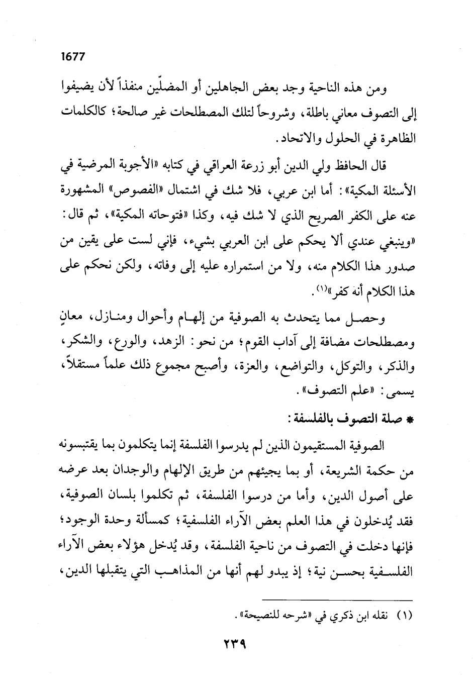 قال الحافظ ولي الدين أبو زرعة العراقي في كتابه "الأجوبة المرضية في الأسئلة المكية": أما ابن عربي، فلا شك في اشتمال "الفصوص" المشهورة عنه على الكفر الصريح الذي لا شك فيه، وكذا "فتوحاته المكية"، ثم قال: "وينبغي عندي ألا يحكم على ابن العربي بشيء، فإني لست على يقين من صدور هذا الكلام منه، ولا من استمراره عليه إلى وفاته، ولكن نحكم على هذا الكلام أنه كفر" (¬1).