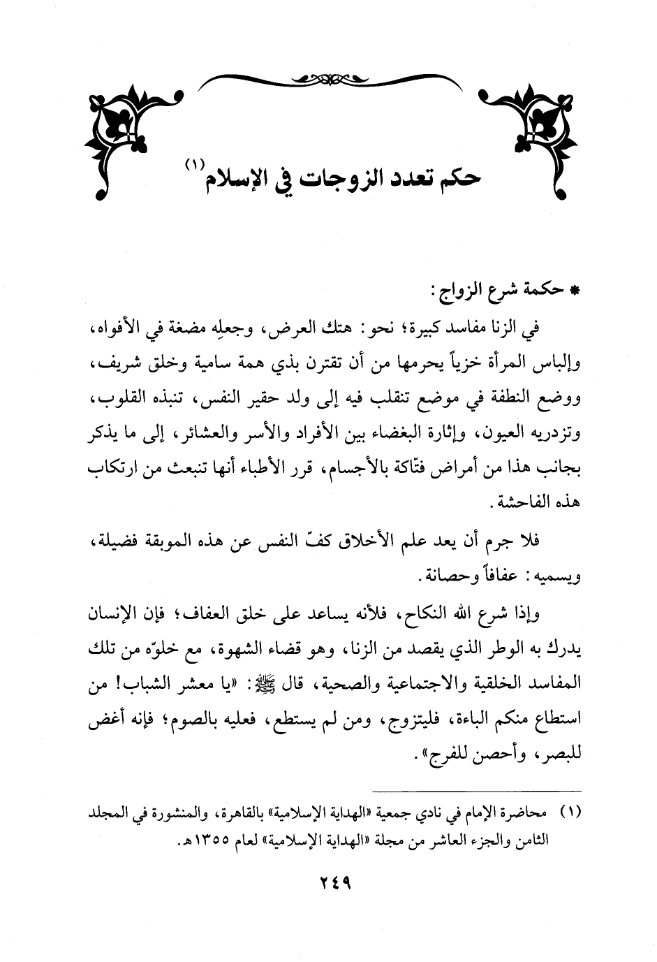(¬1) محاضرة الإمام في نادي جمعية "الهداية الإسلامية" بالقاهرة، والمنشورة في المجلد الثامن والجزء العاشر من مجلة "الهداية الإسلامية" لعام 1355 هـ.