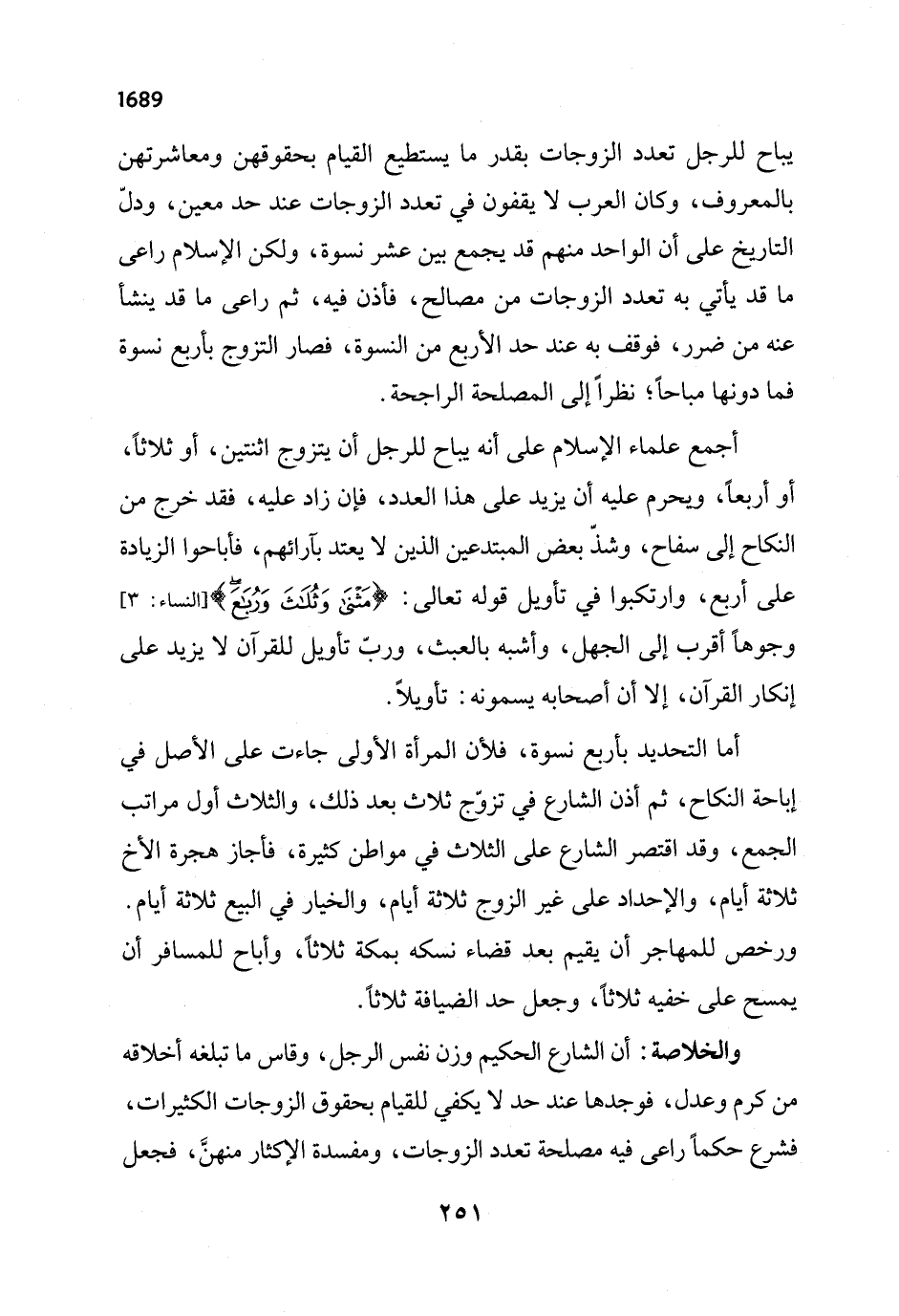 والخلاصة: أن الشارع الحكيم وزن نفس الرجل، وقاس ما تبلغه أخلاقه من كرم وعدل، فوجدها عند حد لا يكفي للقيام بحقوق الزوجات الكثيرات، فشرع حكماً راعى فيه مصلحة تعدد الزوجات، ومفسدة الإكثار منهنَّ، فجعل