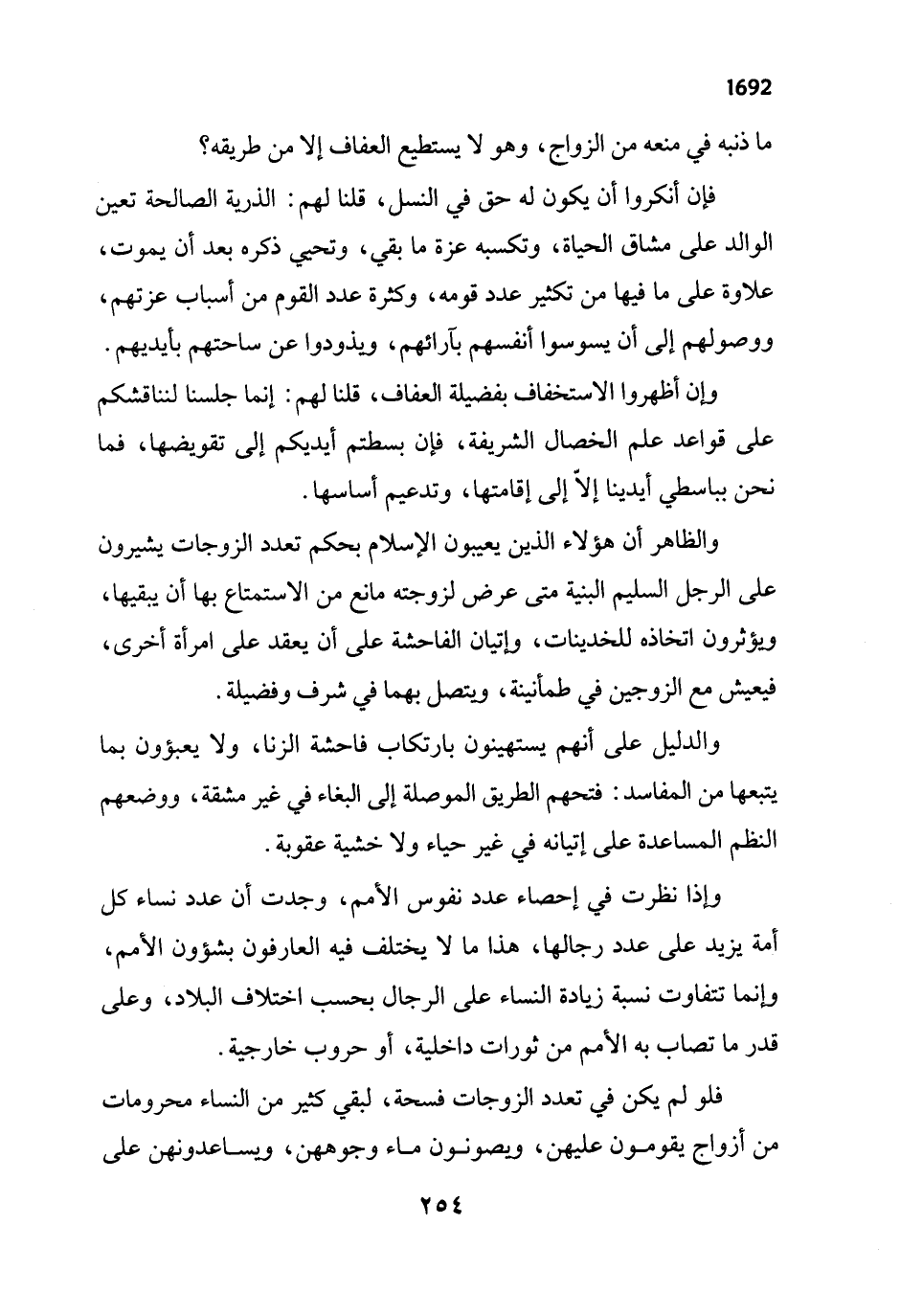 والظاهر أن هؤلاء الذين يعيبون الإسلام بحكم تعدد الزوجات يشيرون على الرجل السليم البنية متى عرض لزوجته مانع من الاستمتاع بها أن يبقيها، ويؤثرون اتخاذه للخدينات، وإتيان الفاحشة على أن يعقد على امرأة أخرى، فيعيش مع الزوجين في طمأنينة، ويتصل بهما في شرف وفضيلة.