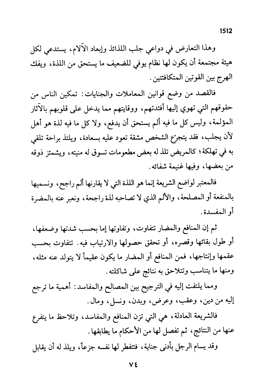 فالقصد من وضع قوانين المعاملات والجنايات: تمكين الناس من حقوقهم التي تهوي إليها أفئدتهم، ووقايتهم مما يدخل على قلوبهم بالآثار المؤلمة، وليس كل ما فيه ألم يستحق أن يدفع، ولا كل ما فيه لذة هو أهل لأن يجلب، فقد يتجرّع الشخص مشقة تعود عليه بسعادة، ويلتذ براحة تلقي به في تهلكة؛ كالمريض تلذ له بعض مطعومات تسوق له منيته، ويشمئز ذوقه من بعضها، وفيها غنيمة شفائه.