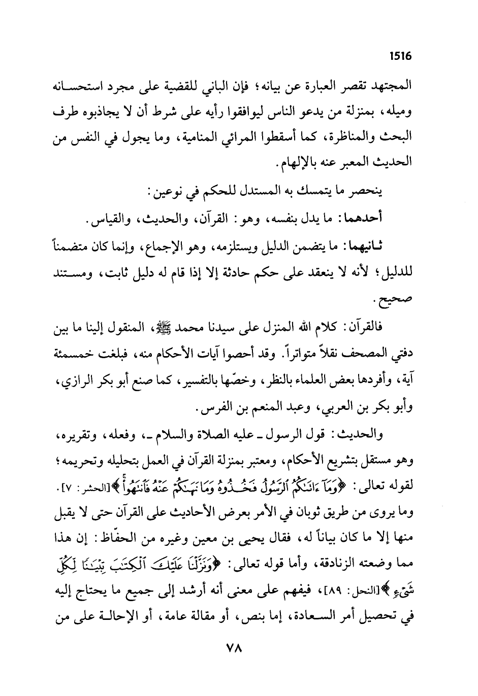 والحديث: قول الرسول - عليه الصلاة والسلام -، وفعله، وتقريره، وهو مستقل بتشريع الأحكام، ومعتبر بمنزلة القرآن في العمل بتحليله وتحريمه؛ لقوله تعالى: {وَمَا آتَاكُمُ الرَّسُولُ فَخُذُوهُ وَمَا نَهَاكُمْ عَنْهُ فَانْتَهُوا} [الحشر: 7]. وما يروى من طريق ثوبان في الأمر بعرض الأحاديث على القرآن حتى لا يقبل منها إلا ما كان بياناً له، فقال يحيى بن معين وغيره من الحفّاظ: إن هذا مما وضعته الزنادقة، وأما قوله تعالى: {وَنَزَّلْنَا عَلَيْكَ الْكِتَابَ تِبْيَانًا لِكُلِّ شَيْءٍ} [النحل: 89]، فيفهم على معنى أنه أرشد إلى جميع ما يحتاج إليه في تحصيل أمر السعادة، إم بنص، أو مقالة عامة، أو الإحالة على من