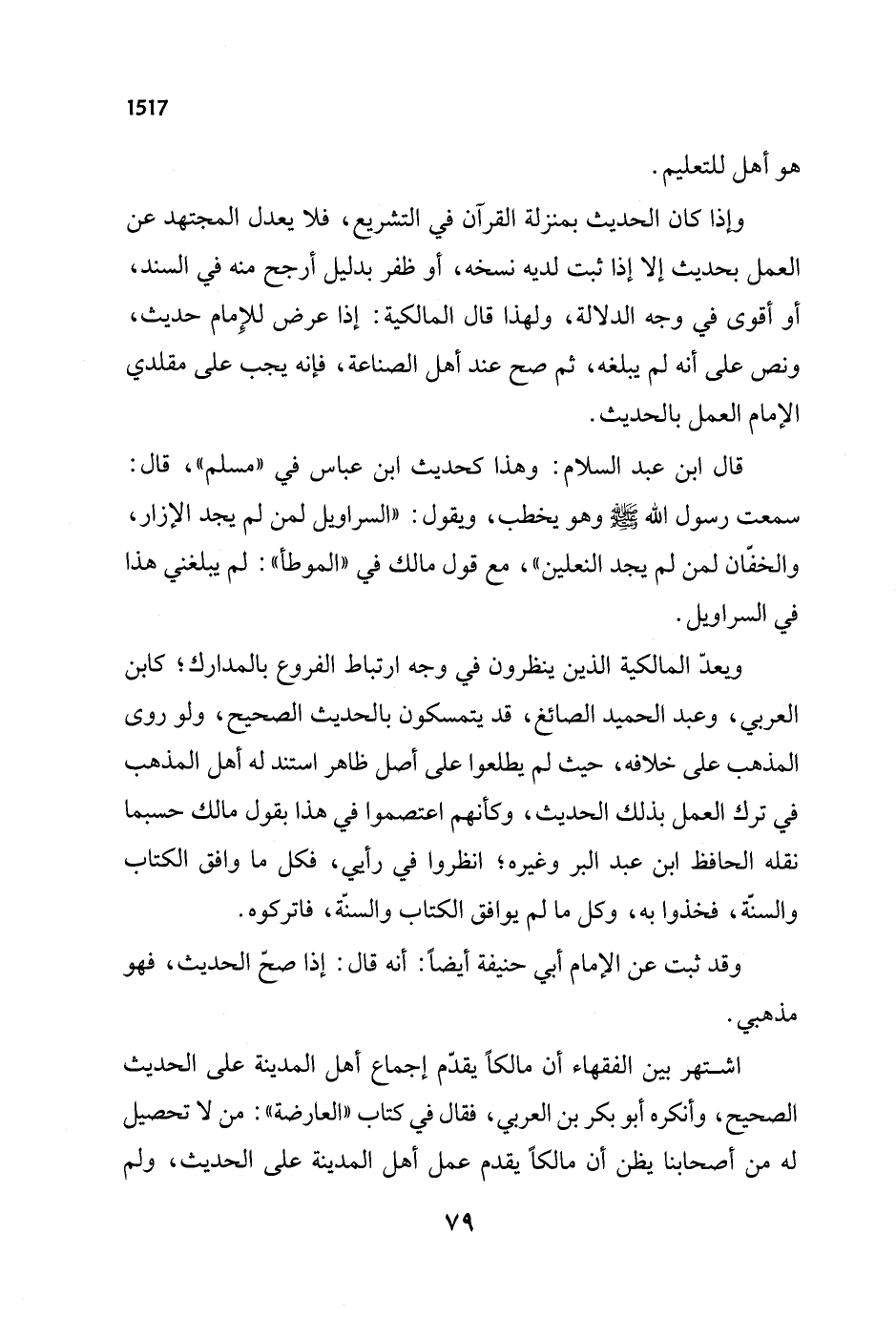 وإذا كان الحديث بمنزلة القرآن في التشريع، فلا يعدل المجتهد عن العمل بحديث إلا إذا ثبت لديه نسخه، أو ظفر بدليل أرجح منه في السند، أو أقوى في وجه الدلالة، ولهذا قال المالكية: إذا عرض للإِمام حديث، ونص على أنه لم يبلغه، ثم صح عند أهل الصناعة، فإنه يجب على مقلدي الإِمام العمل بالحديث.