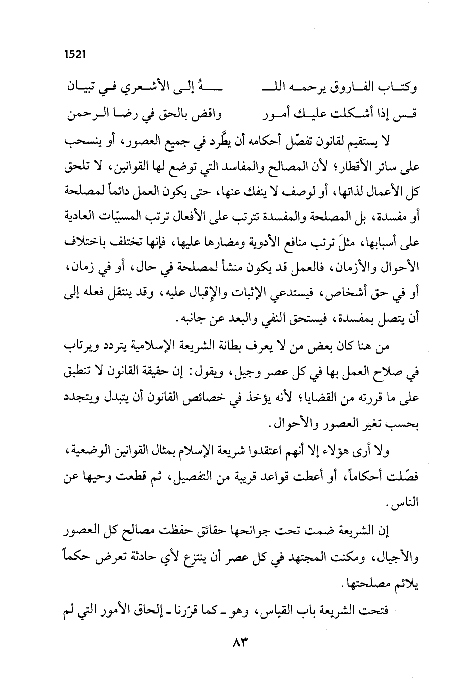 لا يستقيم لقانون تفصّل أحكامه أن يطَّرد في جميع العصور، أو ينسحب على سائر الأقطار؛ لأن المصالح والمفاسد التي توضع لها القوانين، لا تلحق كل الأعمال لذاتها، أو لوصف لا ينفك عنها، حتى يكون العمل دائمًا لمصلحة أو مفسدة، بل المصلحة والمفسدة تترتب على الأفعال ترتب المسبّبات العادية على أسبابها، مثلَ ترتب منافع الأدوية ومضارها عليها، فإنها تختلف باختلاف الأحوال والأزمان، فالعمل قد يكون منشأ لمصلحة في حال، أو في زمان، أو في حق أشخاص، فيستدعي الإثبات والإِقبال عليه، وقد ينتقل فعله إلى أن يتصل بمفسدة، فيستحق النفي والبعد عن جانبه.