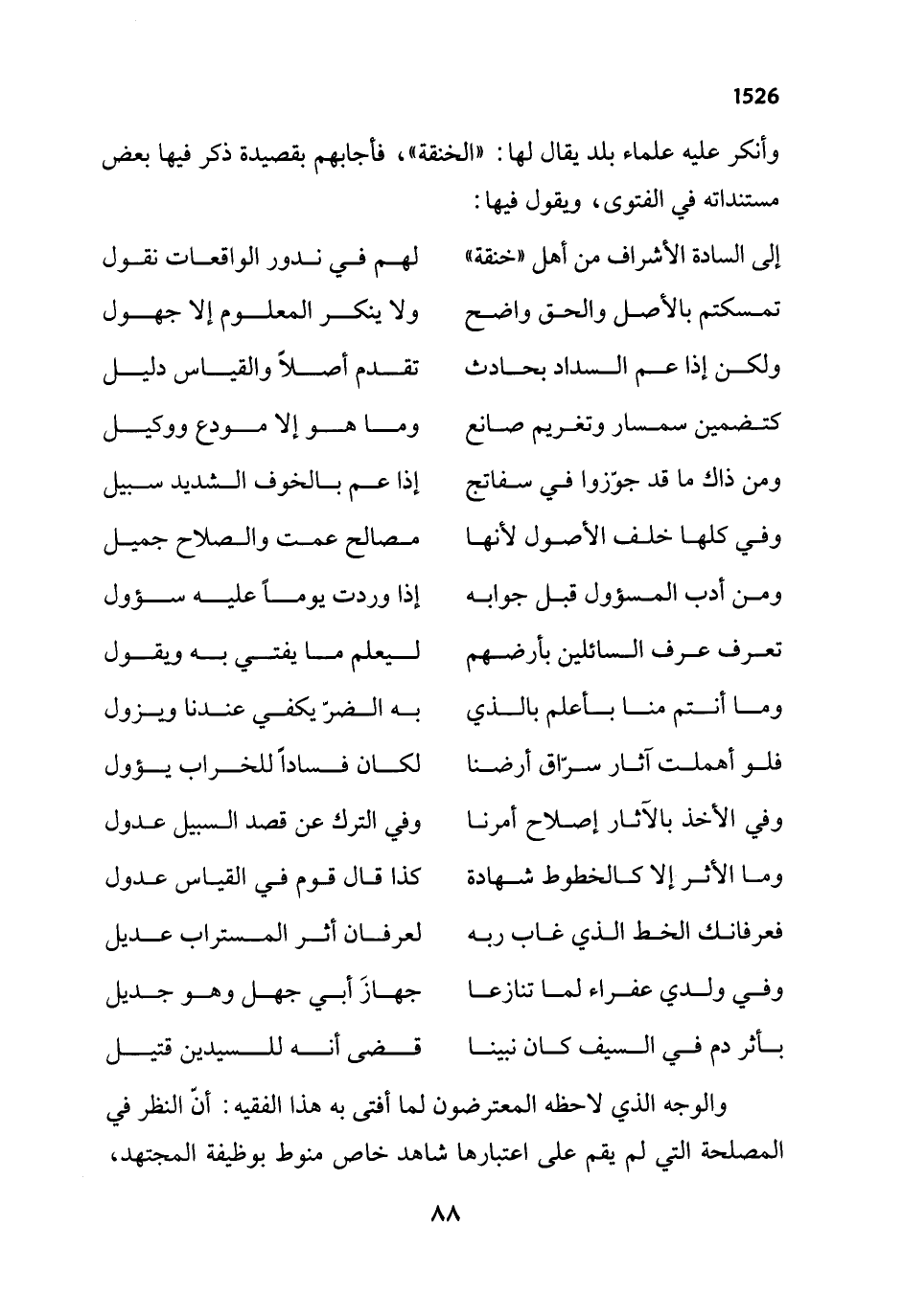 وأنكر عليه علماء بلد يقال لها: "الخنقة"، فأجابهم بقصيدة ذكر فيها بعض مستنداته في الفتوى، ويقول فيها: