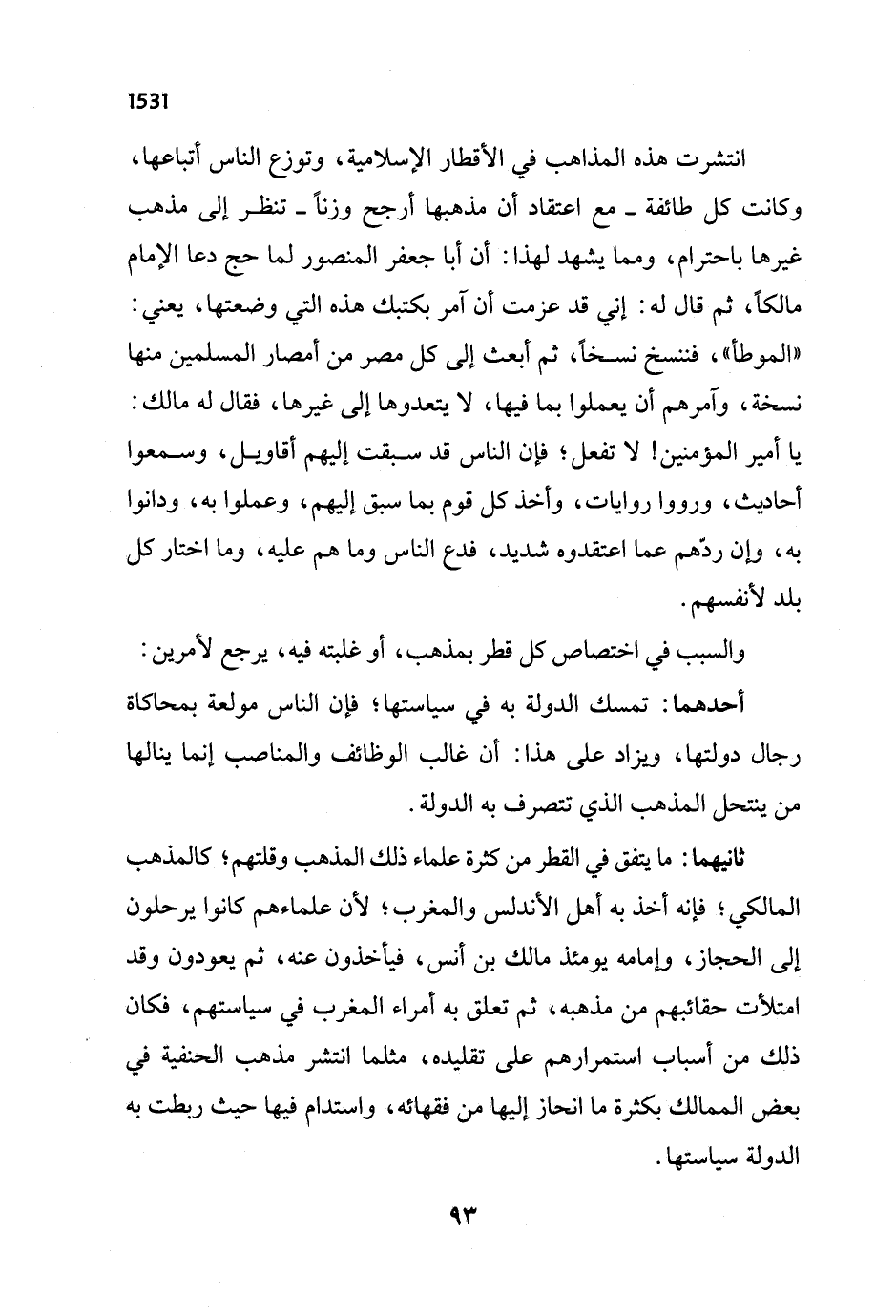 ثانيهما: ما يتفق في القطر من كثرة علماء ذلك المذهب وقلتهم؛ كالمذهب المالكي؛ فإنه أخذ به أهل الأندلس والمغرب؛ لأن علماءهم كانوا يرحلون إلى الحجاز، وإمامه يومئذ مالك بن أنس، فيأخذون عنه، ثم يعودون وقد امتلأت حقائبهم من مذهبه، ثم تعلق به أمراء المغرب في سياستهم، فكان ذلك من أسباب استمرارهم على تقليده، مثلما انتشر مذهب الحنفية في بعض الممالك بكثرة ما انحاز إليها من فقهائه، واستدام فيها حيث ربطت به الدولة سياستها.