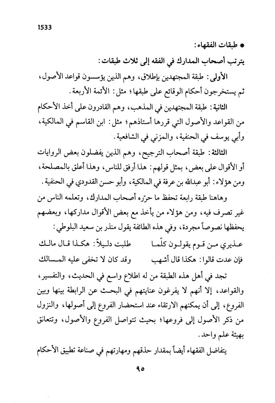 الثالثة: طبقة أصحاب الترجيح، وهم الذين يفضلون بعض الروايات أو الأقوال على بعض، بمثل قولهم: هذا أرفق للناس، وهذا أعلق بالمصلحة، ومن هؤلاء: أبو عبد الله بن عرفة في المالكية، وأبو حسن القدودي في الحنفية.