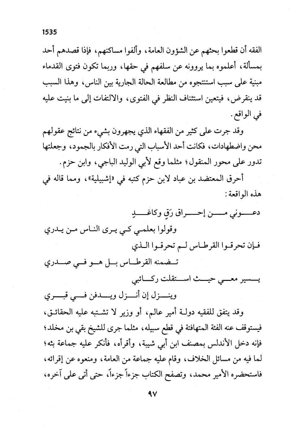 الفقه أن قطعوا بحثهم عن الشؤون العامة، وألفوا مساكنهم، فإذا قصدهم أحد بمسألة، أعلموه بما يروونه عن سلفهم في حقها، وربما تكون فتوى القدماء مبنية على سبب استنتجوه من مطالعة الحالة الجارية بين الناس، وهذا السبب قد ينقرض، فيتعين استئناف النظر في الفتوى، والالتفات إلى ما بين يت عليه في الواقع.