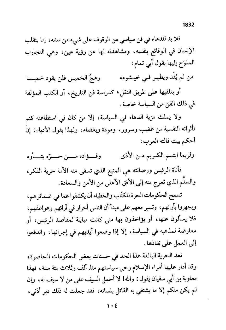 ولا يملك مزية الدهاء في السياسة، إلا من كان في استطاعته كتم تأثراته النفسية من غضب وسرور، ومودة وبغضاء، ولهذا يقول الأدباء: إنّ أحكم بيت قالته العرب: