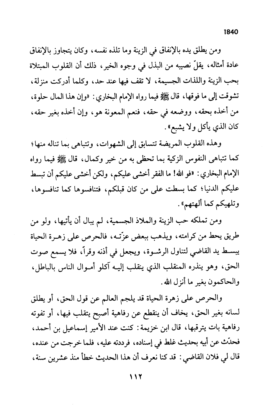 ومن تملكه حب الزينة والملاذ الجسمية، لم يبال أن يأتيها، ولو من طريق يحط من كرامته، ويذهب ببعض عزّته، فالحرص على زهرة الحياة يبسط يد القاضي لتناول الرشوة، ويجعل في أذنه وقراً، فلا يسمع صوت الحق، وهو ينذره المنقلب الذي ينقلب إليه آكلو أموال الناس بالباطل، والحاكمون بغير ما أنزل الله.