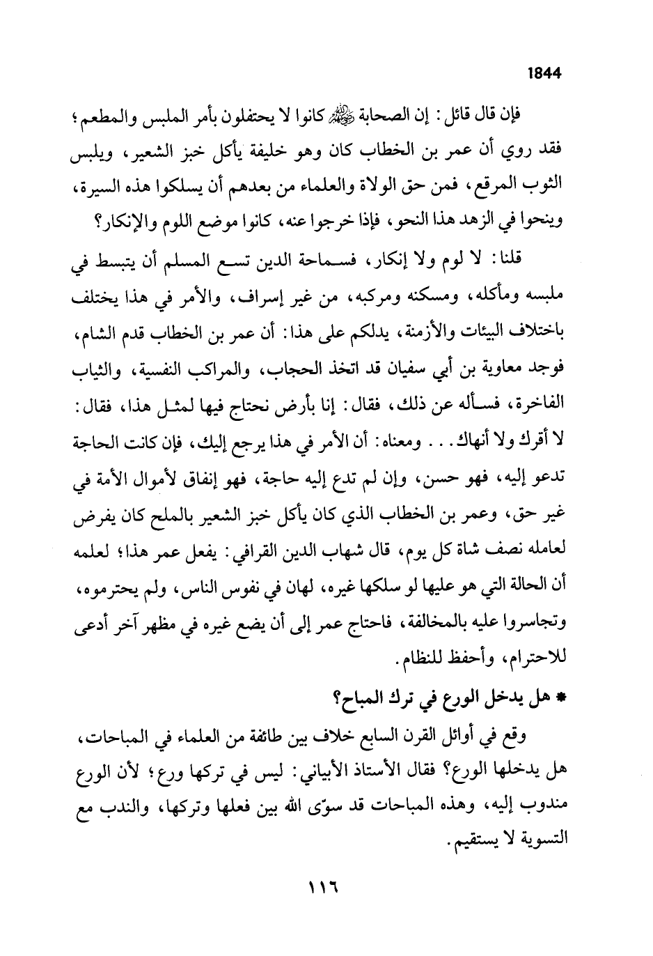 فإن قال قائل: إن الصحابة - رضي الله عنه - كانوا لا يحتفلون بأمر الملبس والمطعم؛ فقد روي أن عمر بن الخطاب كان وهو خليفة يأكل خبز الشعير، ويلبس الثوب المرقع، فمن حق الولاة والعلماء من بعدهم أن يسلكوا هذه السيرة، وينحوا في الزهد هذا النحو، فإذا خرجوا عنه، كانوا موضع اللوم والإنكار؟