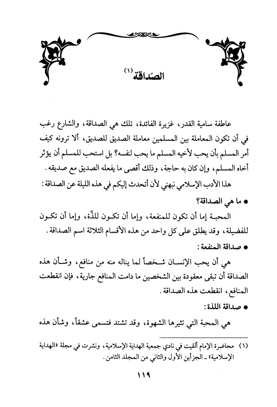 عاطفة سامية القدر، غزيرة الفائدة، تلك هي الصداقة، والشارع رغب في أن تكون المعاملة بين المسلمين معاملة الصديق للصديق، ألا ترونه كيف أمر المسلم بأن يحب لأخيه المسلم ما يحب لنفسه؟ بل استحب للمسلم أن يؤثر أخاه المسلم، وإن كان به حاجة، وذلك أقصى ما يفعله الصديق مع صديقه.