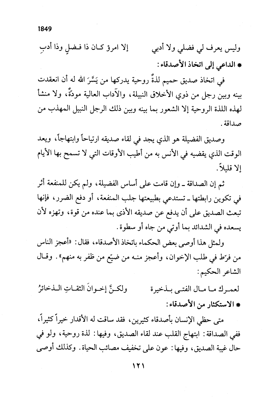 ولمثل هذا أوصى بعض الحكماء باتخاذ الأصدقاء، فقال: "أعجز الناس من فرّط في طلب الإخوان، وأعجز منه من ضيعّ من ظفر به منهم". وقال الشاعر الحكيم:
