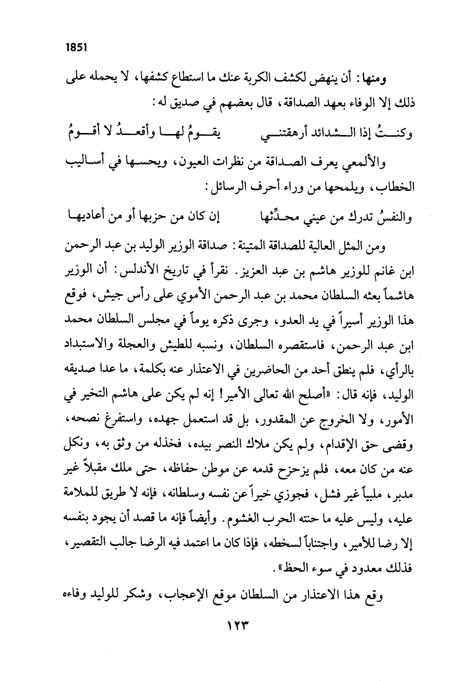 ومن المثل العالية للصداقة المتينة: صداقة الوزير الوليد بن عبد الرحمن ابن غانم للوزير هاشم بن عبد العزيز. نقرأ في تاريخ الأندلس: أن الوزير هاشماً بعثه السلطان محمد بن عبد الرحمن الأموي على رأس جيش، فوقع هذا الوزير أسيراً في يد العدو، وجرى ذكره يوماً في مجلس السلطان محمد ابن عبد الرحمن، فاستقصره السلطان، ونسبه للطيش والعجلة والاستبداد بالرأي، فلم ينطق أحد من الحاضرين في الاعتذار عنه بكلمة، ما عدا صديقه الوليد، فإنه قال: "أصلح الله تعالى الأمير! إنه لم يكن على هاشم التخير في الأمور، ولا الخروج عن المقدور، بل قد استعمل جهده، واستفرغ نصحه، وقضى حق الإقدام، ولم يكن ملاك النصر بيده، فخذله من وثق به، ونكل عنه من كان معه، فلم يزحزح قدمه عن موطن حفاظه، حتى ملك مقبلاً غير مدبر، ملبياً غير فشل، فجوزي خيراً عن نفسه وسلطانه، فإنه لا طريق للملامة عليه، وليس عليه ما حنته الحرب الغشوم. وأيضاً فإنه ما قصد أن يجود بنفسه إلا رضا للأمير، واجتناباً لسخطه، فإذا كان ما اعتمد فيه الرضا جالب التقصير، فذلك معدود في سوء الحظ".
