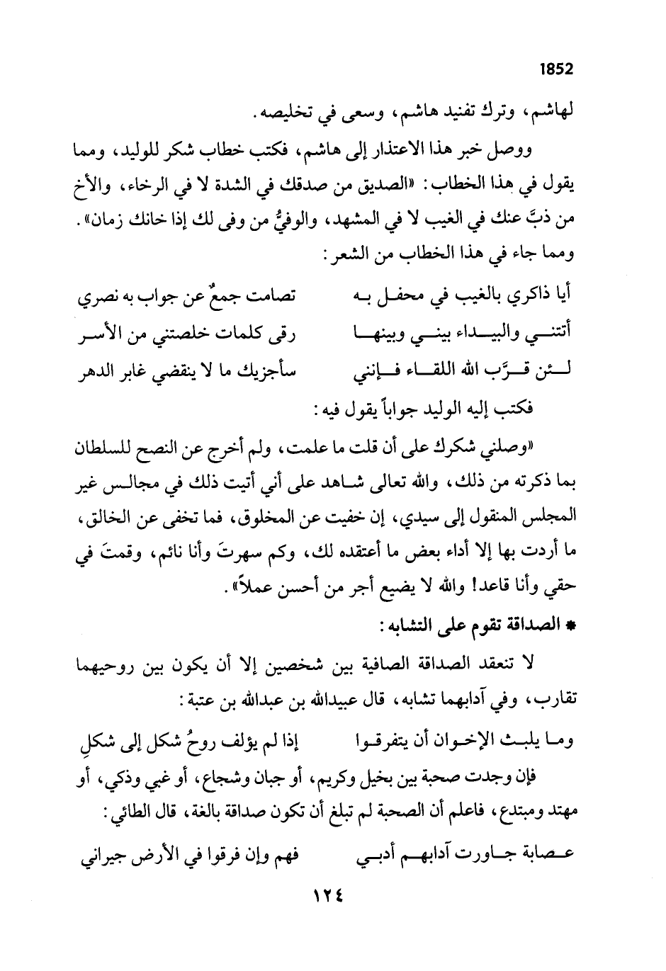 لا تنعقد الصداقة الصافية بين شخصين إلا أن يكون بين روحيهما تقارب، وفي آدابهما تشابه، قال عبيد الله بن عبد الله بن عتبة:
