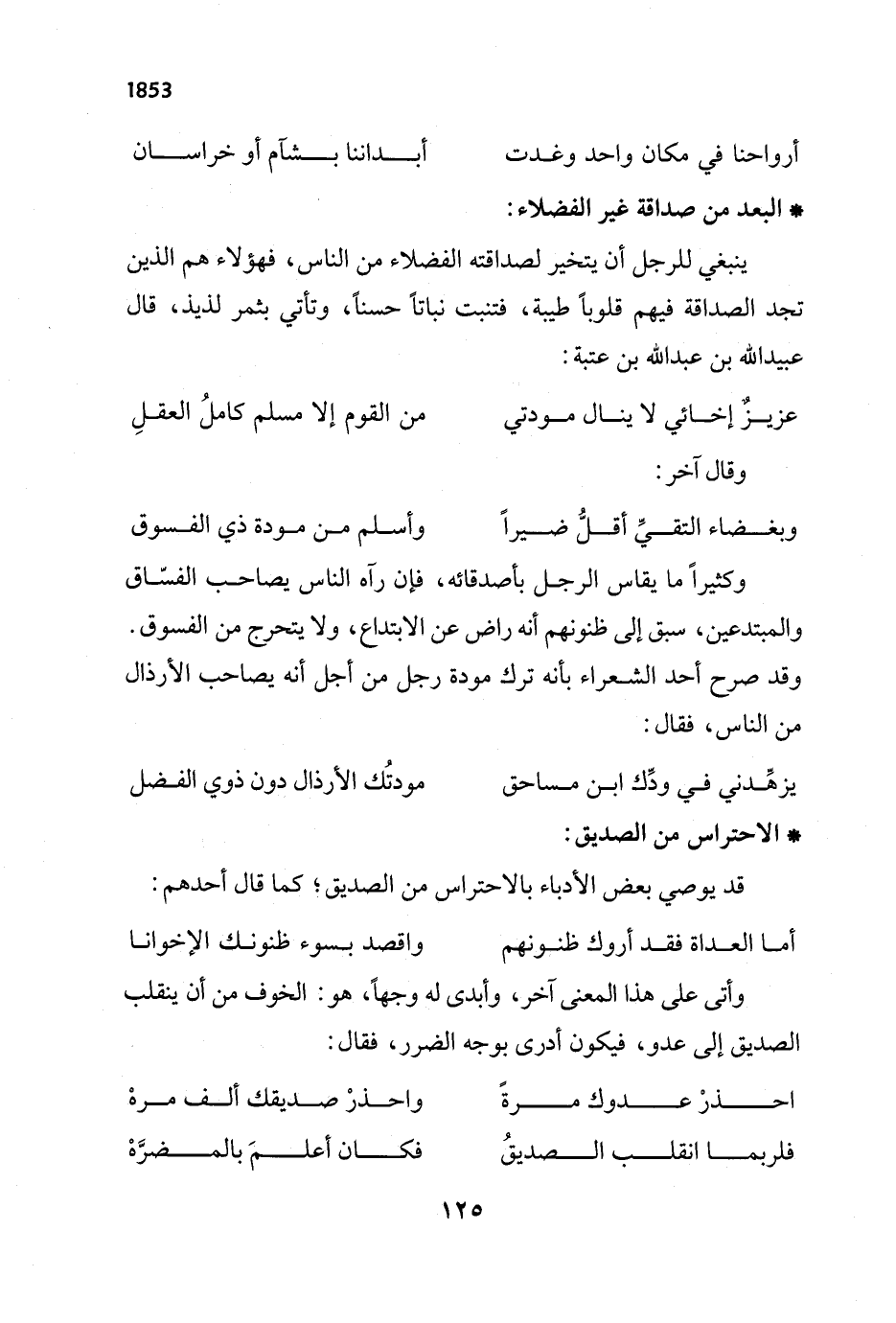 ينبغي للرجل أن يتخير لصداقته الفضلاء من الناس، فهؤلاء هم الذين تجد الصداقة فيهم قلوباً طيبة، فتنبت نباتاً حسناً، وتأتي بثمر لذيذ، قال عبيد الله بن عبدالله بن عتبة: