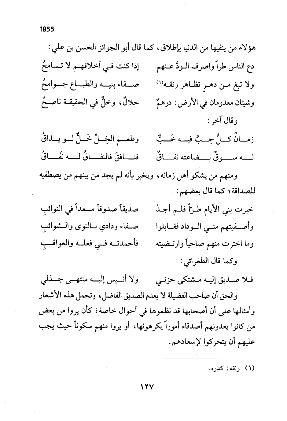 والحق أن صاحب الفضيلة لا يعدم الصديق الفاضل، وتحمل هذه الأشعار وأمثالها على أن أصحابها قد نظموها في أحوال خاصة؛ كأن يروا من بعض من كانوا يعدونهم أصدقاء أموراً يكرهونها، أو يروا منهم سكوناً حيث يجب عليهم أن يتحركوا لإسعادهم.