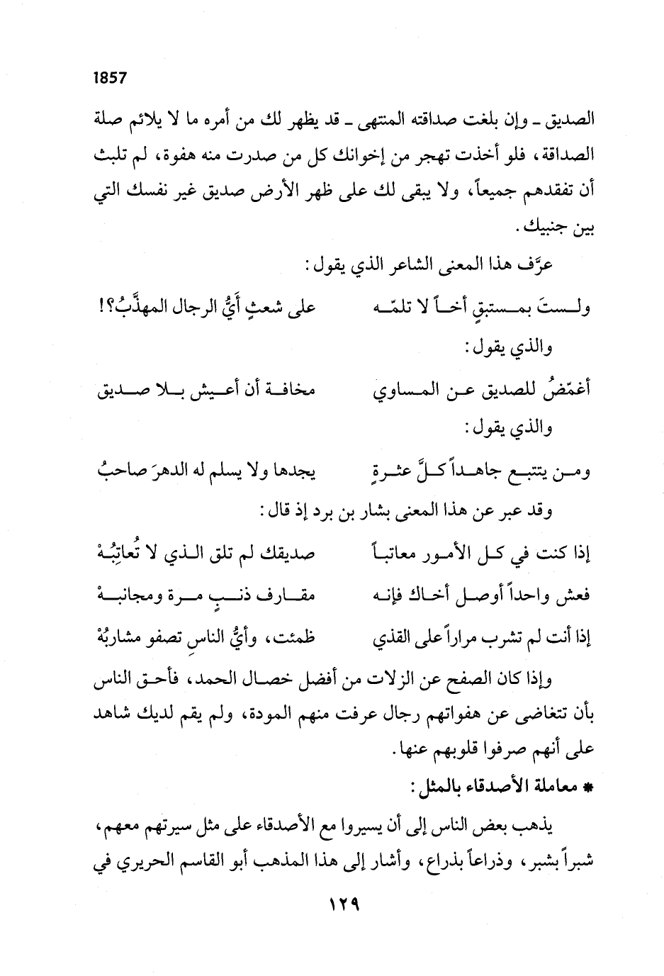يذهب بعض الناس إلى أن يسيروا مع الأصدقاء على مثل سيرتهم معهم، شبراً بشبر، وذراعاً بذراع، وأشار إلى هذا المذهب أبو القاسم الحريري في