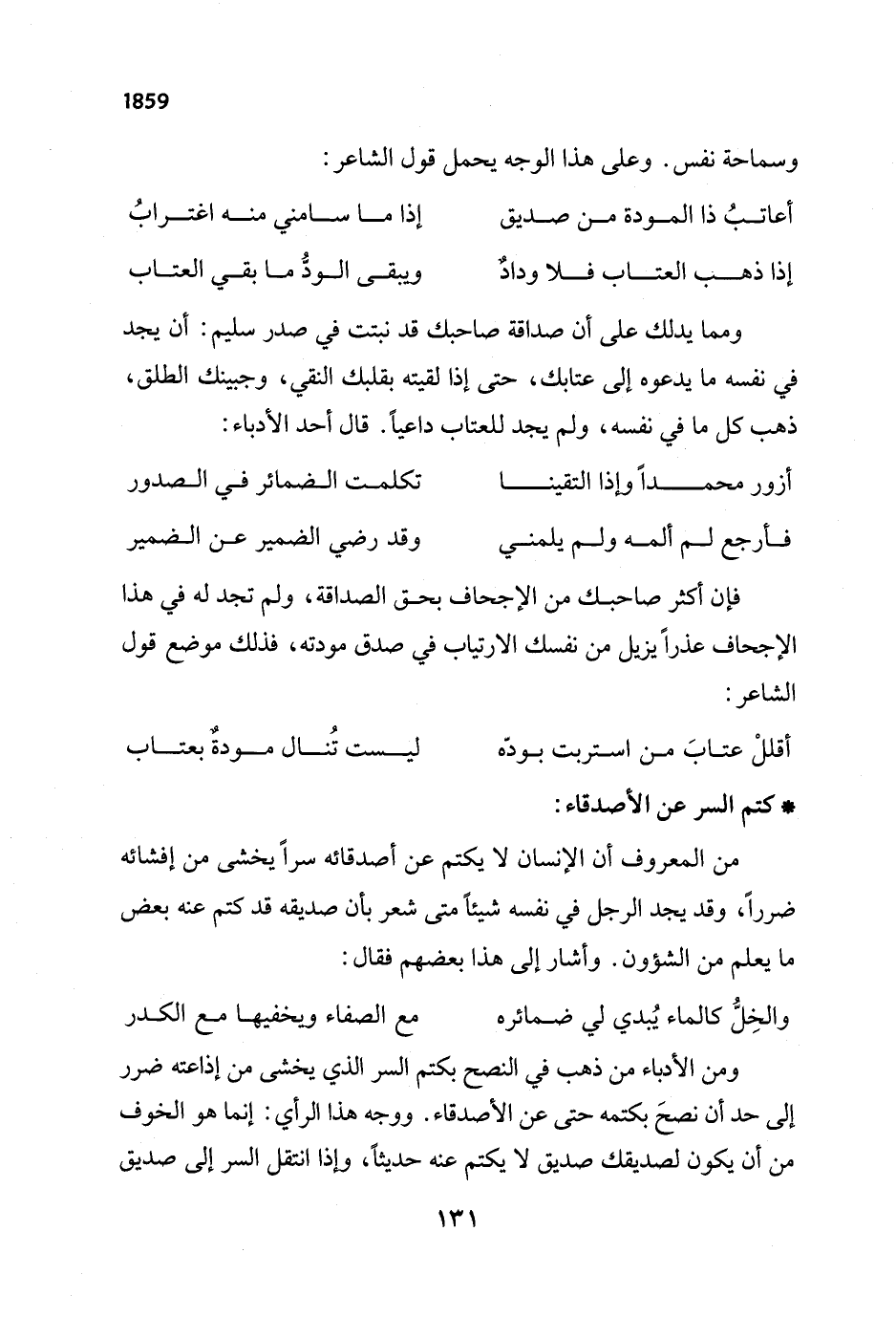 من المعروف أن الإنسان لا يكتم عن أصدقائه سراً يخشى من إفشائه ضرراً، وقد يجد الرجل في نفسه شيئاً متى شعر بأن صديقه قد كتم عنه بعض ما يعلم من الشؤون. وأشار إلى هذا بعضهم فقال: