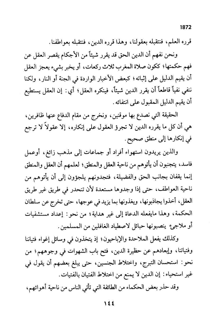 ونحن نفهم أن الدين الحق قد يقرر شيئاً من الأحكام يقصر العقل عن فهم حكمتها؛ ككون صلاة المغرب ثلاث ركعات، أو يخبر بشيء يعجز العقل أن يقيم الدليل على إثباته؛ كبعض الأخبار الواردة في الجنة أو النار، ولكنا ننفي نفياً قاطعاً أن يقرر الدين شيئاً، فينكره العقل؛ أي: إن العقل يستطيع أن يقيم الدليل المقبول على انتفائه.