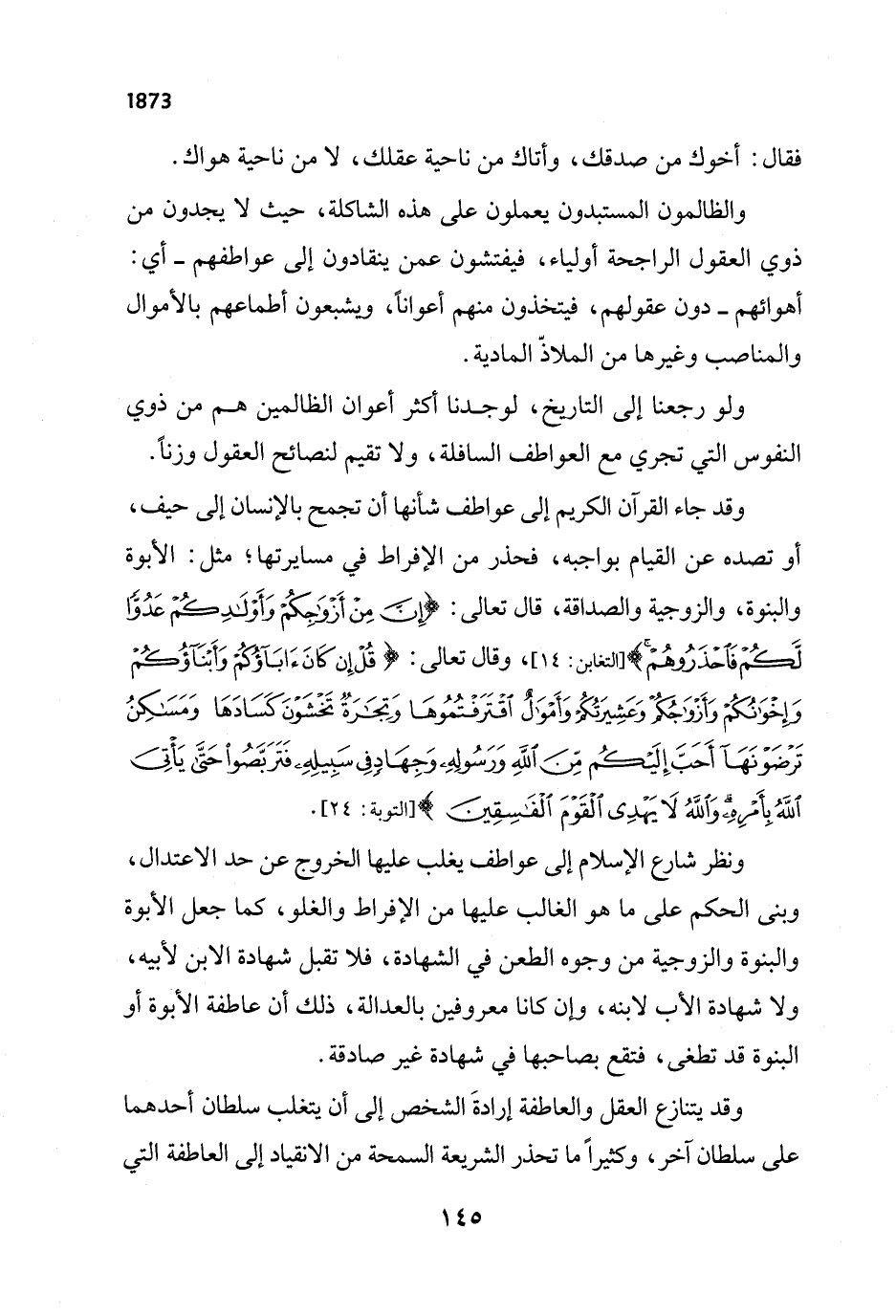 وقد جاء القرآن الكريم إلى عواطف شأنها أن تجمح بالإنسان إلى حيف، أو تصده عن القيام بواجبه، فحذر من الإفراط في مسايرتها؛ مثل: الأبوة والبنوة، والزوجية والصداقة، قال تعالى: {إِنَّ مِنْ أَزْوَاجِكُمْ وَأَوْلَادِكُمْ عَدُوًّا لَكُمْ فَاحْذَرُوهُمْ} [التغابن: 14]، وقال تعالى: {قُلْ إِنْ كَانَ آبَاؤُكُمْ وَأَبْنَاؤُكُمْ وَإِخْوَانُكُمْ وَأَزْوَاجُكُمْ وَعَشِيرَتُكُمْ وَأَمْوَالٌ اقْتَرَفْتُمُوهَا وَتِجَارَةٌ تَخْشَوْنَ كَسَادَهَا وَمَسَاكِنُ تَرْضَوْنَهَا أَحَبَّ إِلَيْكُمْ مِنَ اللَّهِ وَرَسُولِهِ وَجِهَادٍ فِي سَبِيلِهِ فَتَرَبَّصُوا حَتَّى يَأْتِيَ اللَّهُ بِأَمْرِهِ وَاللَّهُ لَا يَهْدِي الْقَوْمَ الْفَاسِقِينَ} [التوبة: 24].