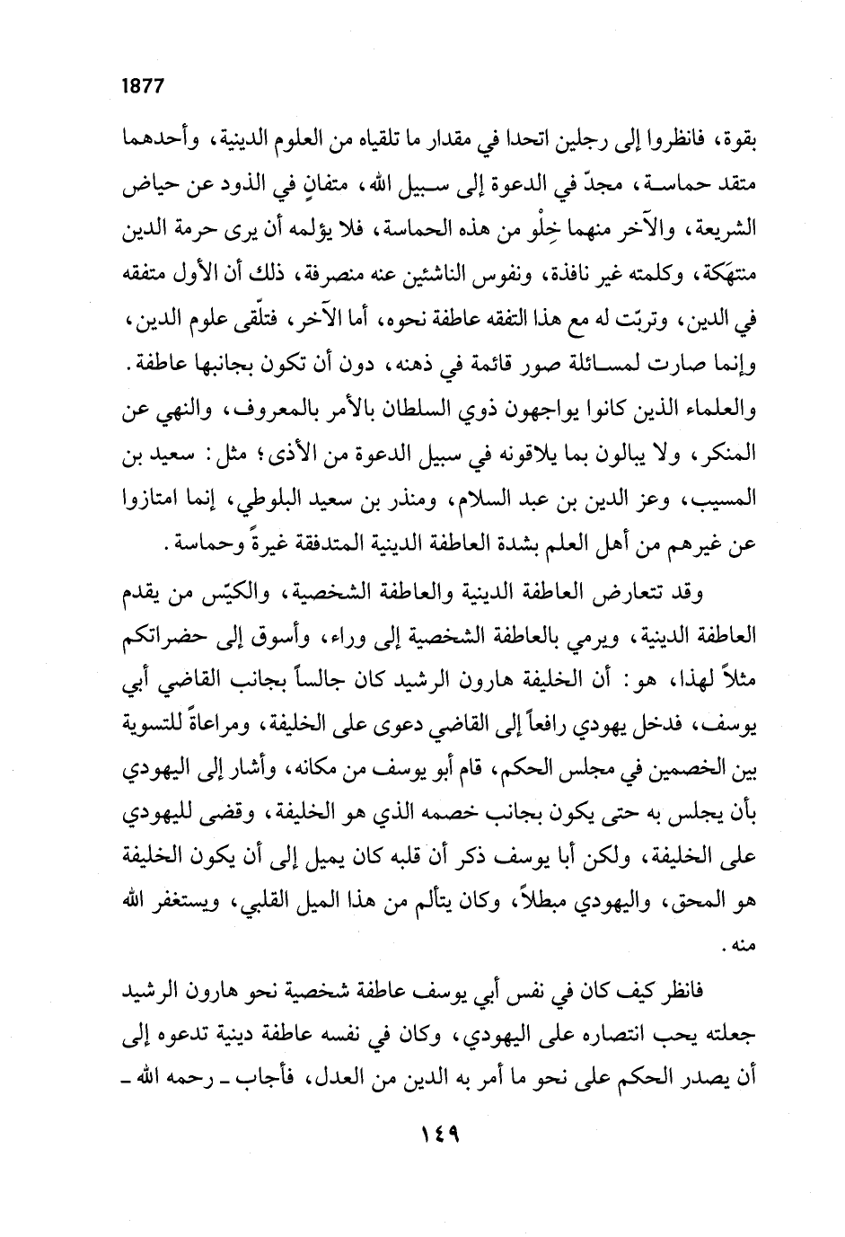 فانظر كيف كان في نفس أبي يوسف عاطفة شخصية نحو هارون الرشيد جعلته يحب انتصاره على اليهودي، وكان في نفسه عاطفة دينية تدعوه إلى أن يصدر الحكم على نحو ما أمر به الدين من العدل، فأجاب -رحمه الله-