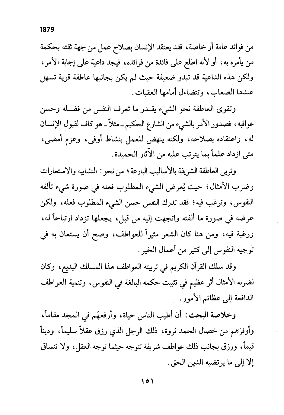 وخلاصة البحث: أن أطيب الناس حياة، وأرفعهَم في المجد مقاماً، وأوفرَهم من خصال الحمد ثروة، ذلك الرجل الذي رزق عقلاً سليماً، وديناً قيماً، ورزق بجانب ذلك عواطف شريفة تتوجه حيثما توجه العقل، ولا تنساق إلا إلى ما يرتضيه الدين الحق.