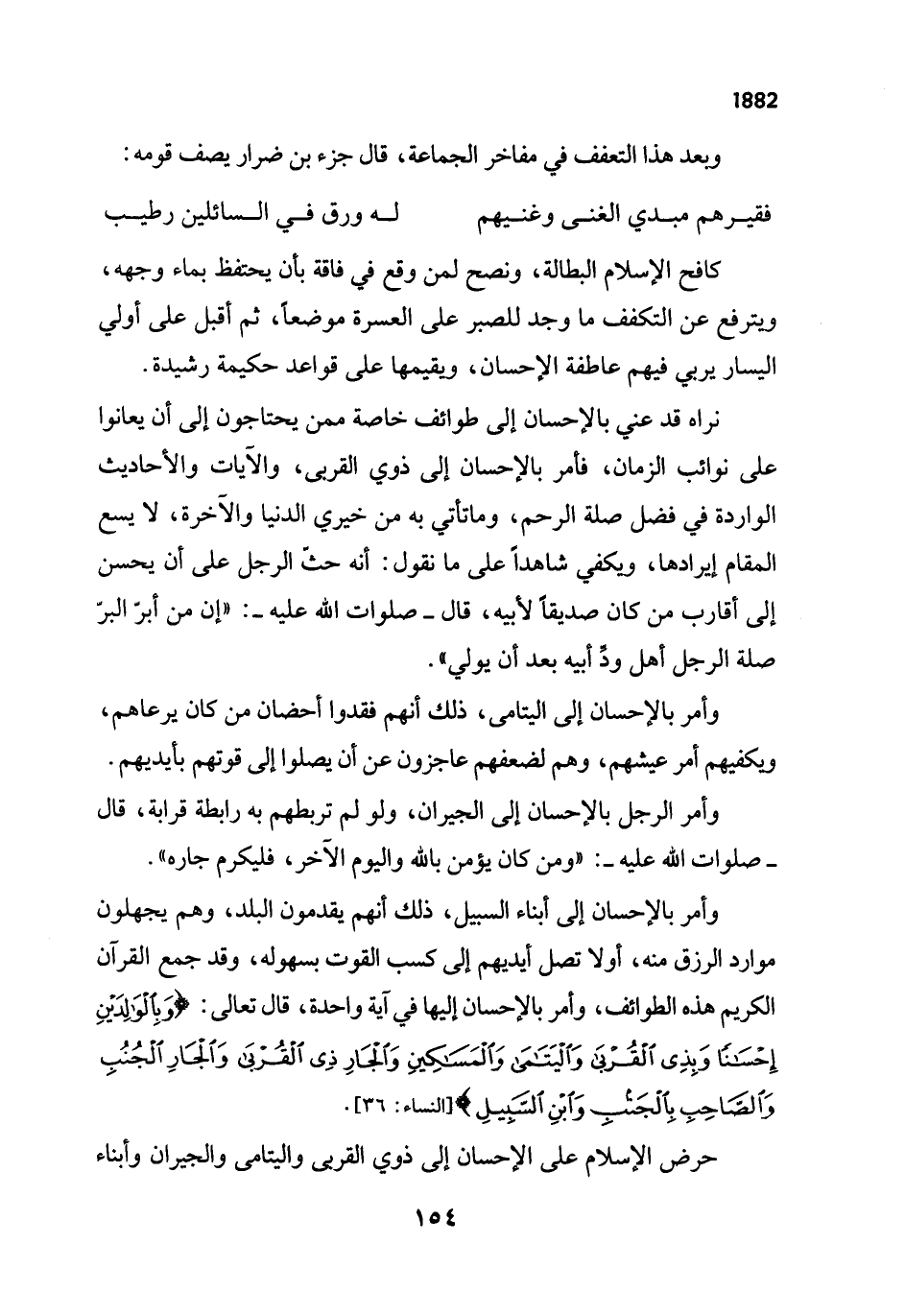 نراه قد عني بالإحسان إلى طوائف خاصة ممن يحتاجون إلى أن يعانوا على نوائب الزمان، فأمر بالإحسان إلى ذوي القربى، والآيات والأحاديث الواردة في فضل صلة الرحم، وماتأتي به من خيري الدنيا والآخرة، لا يسع المقام إيرادها، ويكفي شاهداً على ما نقول: أنه حثّ الرجل على أن يحسن إلى أقارب من كان صديقاً لأبيه، قال - صلوات الله عليه -: "إن من أبرّ البرّ صلة الرجل أهل ودِّ أبيه بعد أن يولي".
