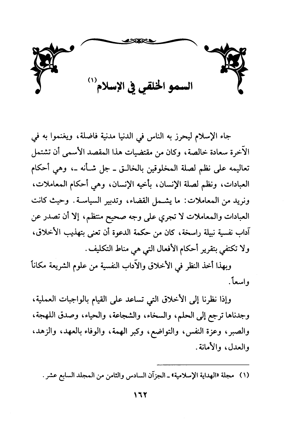 جاء الإسلام ليحرز به الناس في الدنيا مدنية فاضلة، ويغنموا به في الآخرة سعادة خالصة، وكان من مقتضيات هذا المقصد الأسمى أن تشتمل تعاليمه على نظم لصلة المخلوقين بالخالق- جل شأنه - وهي أحكام العبادات، ونظم لصلة الإنسان، بأخيه الإنسان، وهي أحكام المعاملات، ونريد من المعاملات: ما يشمل القضاء، وتدبير السياسة. وحيث كانت العبادات والمعاملات لا تجري على وجه صحيح منتظم، إلا أن تصدر عن آداب نفسية نبيلة راسخة، كان من حكمة الدعوة أن تعنى بتهذيب الأخلاق، ولا تكتفي بتقرير أحكام الأفعال التي هي مناط التكليف.