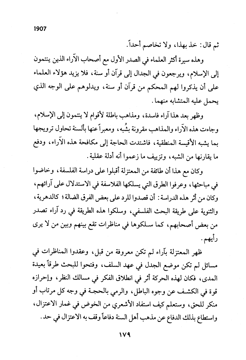 وهذه سيرة أكثر العلماء في الصدر الأول مع أصحاب الآراء الذين ينتمون إلى الإسلام، ويرجعون في الجدال إلى قرآن أو سنة، فلا يزيد هؤلاء العلماء على أن يذكروا لهم المحكم من قرآن أو سنة، ويدلوهم على الوجه الذي يحمل عليه المتشابه منهما.