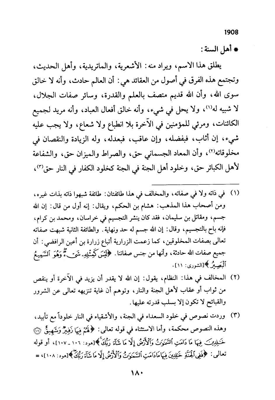 يطلق هذا الاسم، ويراد منه: الأشعرية، والماتريدية، وأهل الحديث، وتجتمع هذه الفرق في أصول من العقائد هي: أن العالم حادث، وأنه لا خالق سوى الله، وأن الله قديم متصف بالعلم والقدرة، وسائر صفات الجلال، لا شبيه له (¬1)، ولا يحل في شيء، وأنه خالق أفعال العباد، وأنه مريد لجميع الكائنات، ومرئي للمؤمنين في الآخرة بلا انطباع ولا شعاع، ولا يجب عليه شيء، إن أثاب، فبفضله، وإن عاقب، فبعدله، وله الزيادة والنقصان في مخلوقاته (¬2)، وأن المعاد الجسماني حق، والصراط والميزان حق، والشفاعة لأهل الكبائر حق، وخلود أهل الجنة في الجنة كخلود الكفار في النار حق (¬3)،