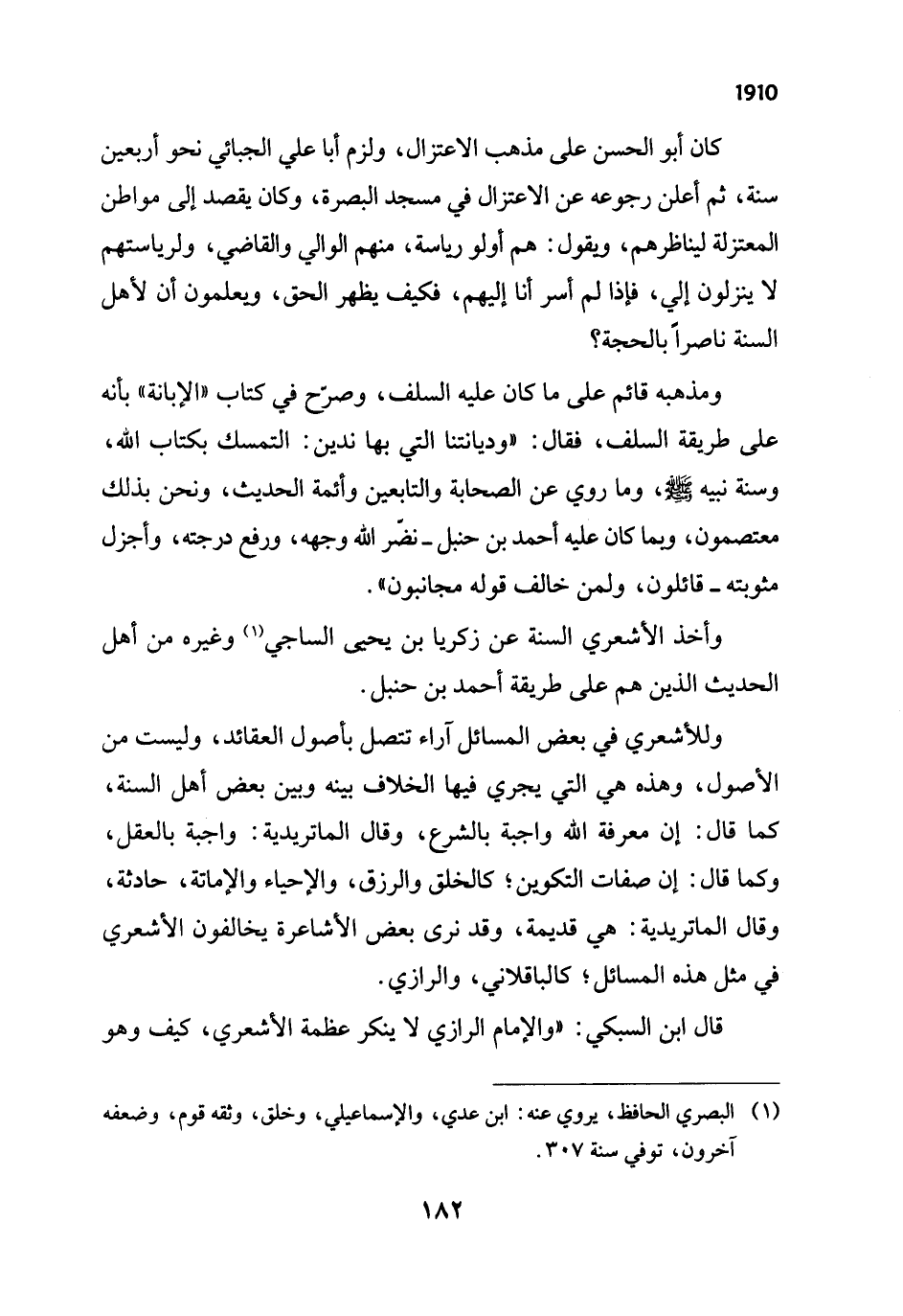 وأخذ الأشعري السنة عن زكريا بن يحيى الساجي (¬1) وغيره من أهل الحديث الذين هم على طريقة أحمد بن حنبل.
