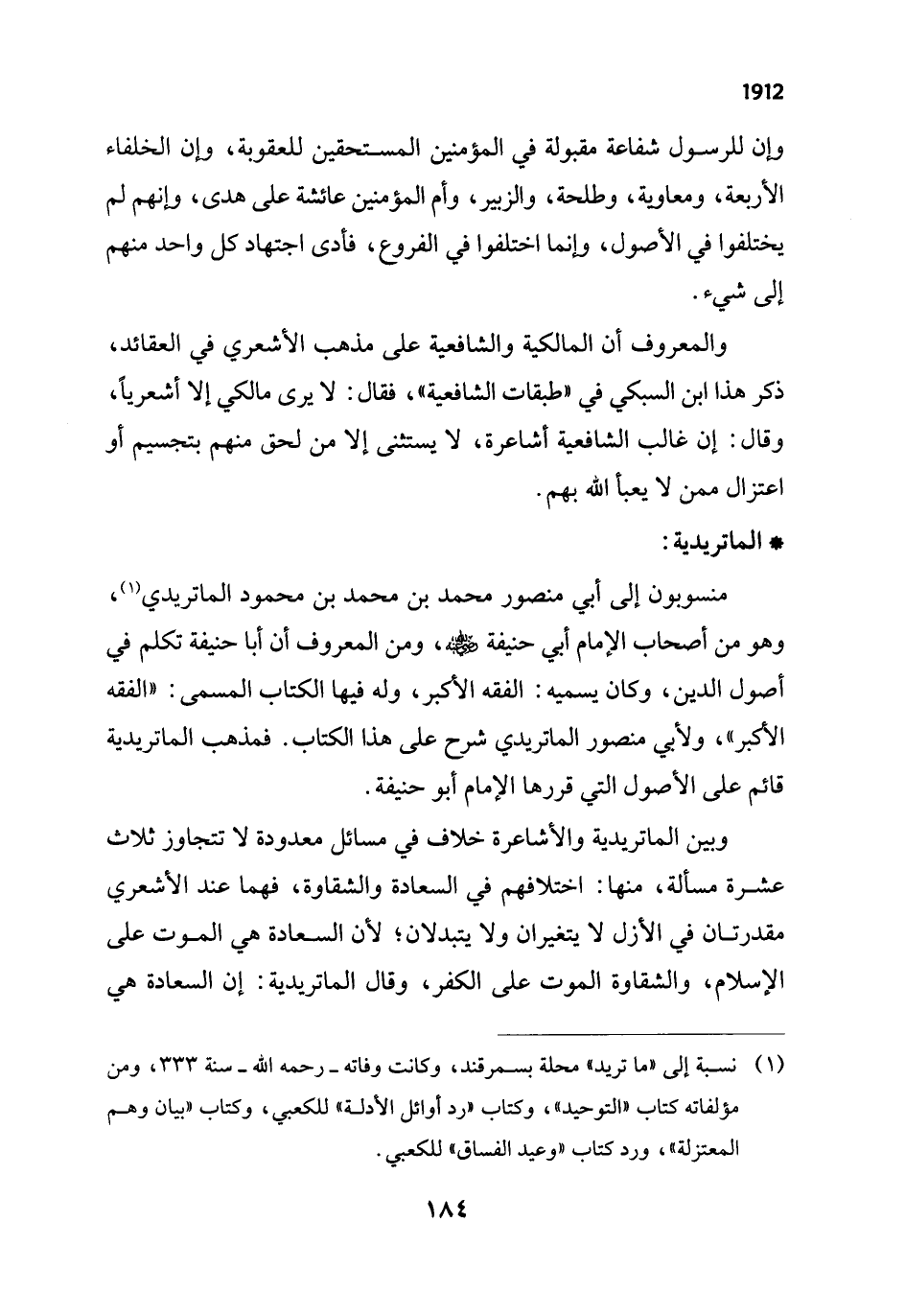(¬1) نسبة إلى "ما تريد" محلة بسمر قند، وكانت وفاته - رحمه الله - سنة 333، ومن مؤلفاته كتاب "التوحيد"، وكتاب "رد أوائل الأدلة" للكعبي، وكتاب "بيان وهم المعتزلة"، ورد كتاب "وعيد الفساق" للكعبي.