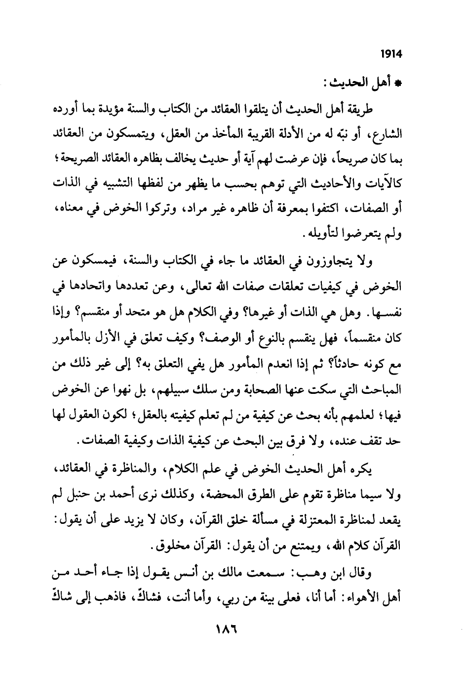 ولا يتجاوزون في العقائد ما جاء في الكتاب والسنة، فيمسكون عن الخوض في كيفيات تعلقات صفات الله تعالى، وعن تعددها واتحادها في نفسها. وهل هي الذات أو غيرها؟ وفي الكلام هل هو متحد أو منقسم؟ وإذا كان منقسماً، فهل ينقسم بالنوع أو الوصف؟ وكيف تعلق في الأزل بالمأمور مع كونه حادثاً؟ ثم إذا انعدم المأمور هل يفي التعلق به؟ إلى غير ذلك من المباحث التي سكت عنها الصحابة ومن سلك سبيلهم، بل نهوا عن الخوض فيها؛ لعلمهم بأنه بحث عن كيفية من لم تعلم كيفيته بالعقل؛ لكون العقول لها حد تقف عنده، ولا فرق بين البحث عن كيفية الذات وكيفية الصفات.