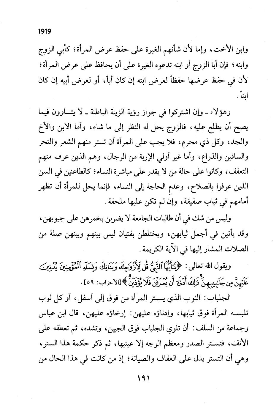 وليس من شك في أن طالبات الجامعة لا يضربن بخمرهن على جيوبهن، وقد يأتين في أجمل ثيابهن، ويختلطن بفتيان ليس بينهم وبينهن صلة من الصلات المشار إليها في الآية الكريمة.