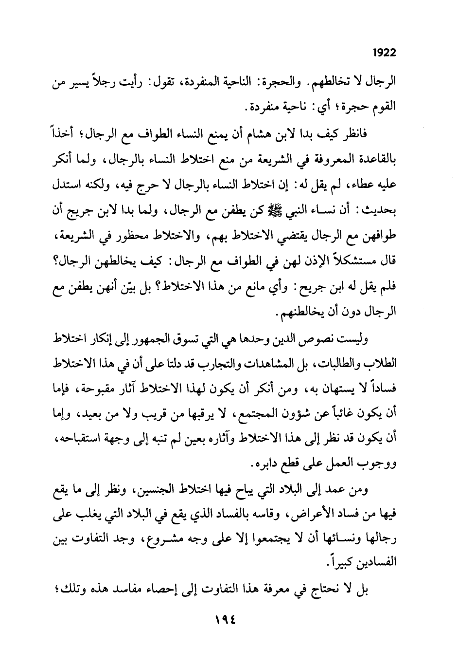 فانظر كيف بدا لابن هشام أن يمنع النساء الطواف مع الرجال؛ أخذاً بالقاعدة المعروفة في الشريعة من منع اختلاط النساء بالرجال، ولما أنكر عليه عطاء، لم يقل له: إن اختلاط النساء بالرجال لا حرج فيه، ولكنه استدل بحديث: أن نساء النبي - صلى الله عليه وسلم - كن يطفن مع الرجال، ولما بدا لابن جريج أن طوافهن مع الرجال يقتضي الاختلاط بهم، والاختلاط محظور في الشريعة، قال مستشكلًا الإذن لهن في الطواف مع الرجال: كيف يخالطهن الرجال؟ فلم يقل له ابن جريح: وأي مانع من هذا الاختلاط؟ بل بيّن أنهن يطفن مع الرجال دون أن يخالطنهم.