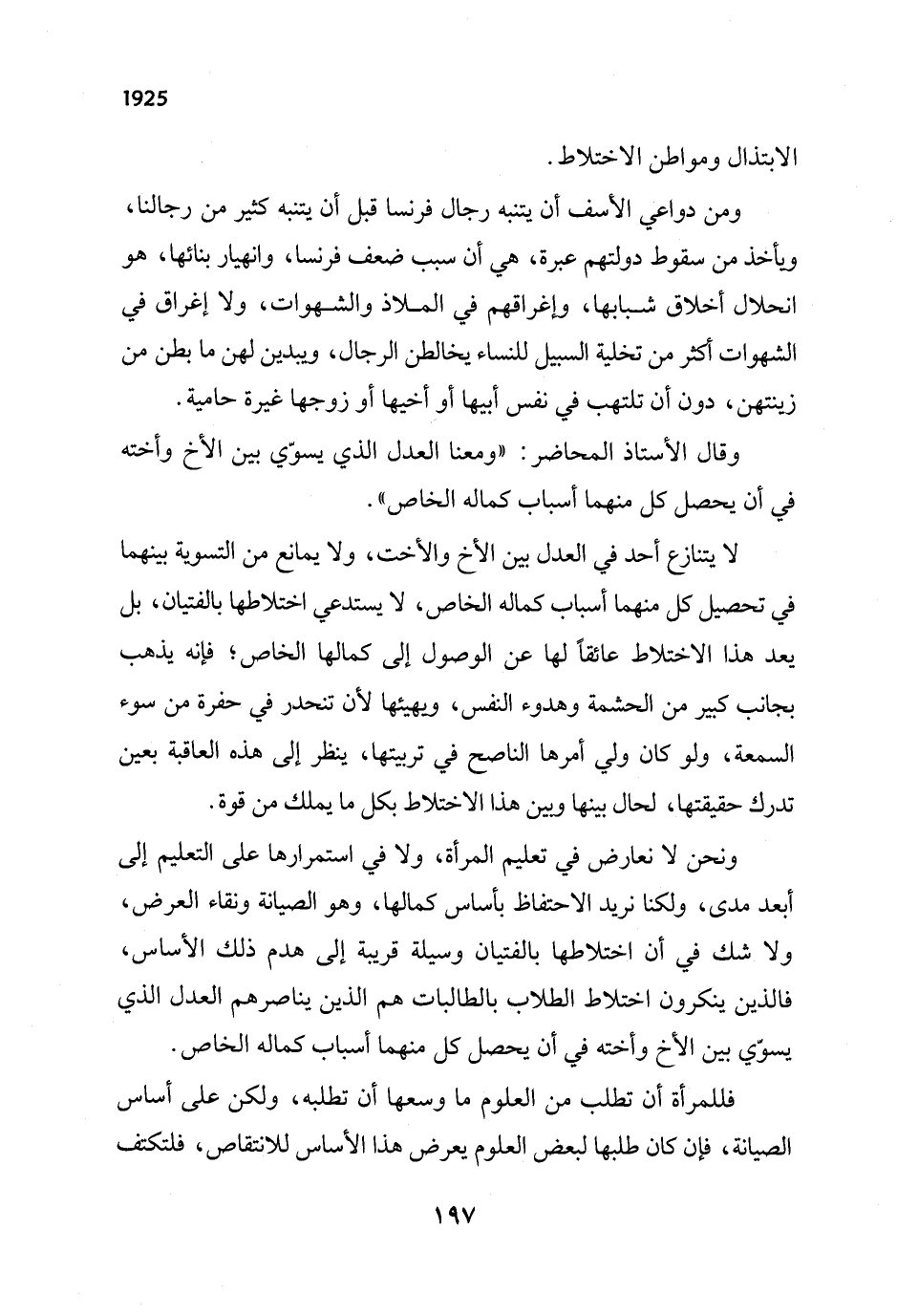 ونحن لا نعارض في تعليم المرأة، ولا في استمرارها على التعليم إلى أبعد مدى، ولكنا نريد الاحتفاظ بأساس كمالها، وهو الصيانة ونقاء العرض، ولا شك في أن اختلاطها بالفتيان وسيلة قريبة إلى هدم ذلك الأساس، فالذين ينكرون اختلاط الطلاب بالطالبات هم الذين يناصرهم العدل الذي يسوّي بين الأخ وأخته في أن يحصل كل منهما أسباب كماله الخاص.