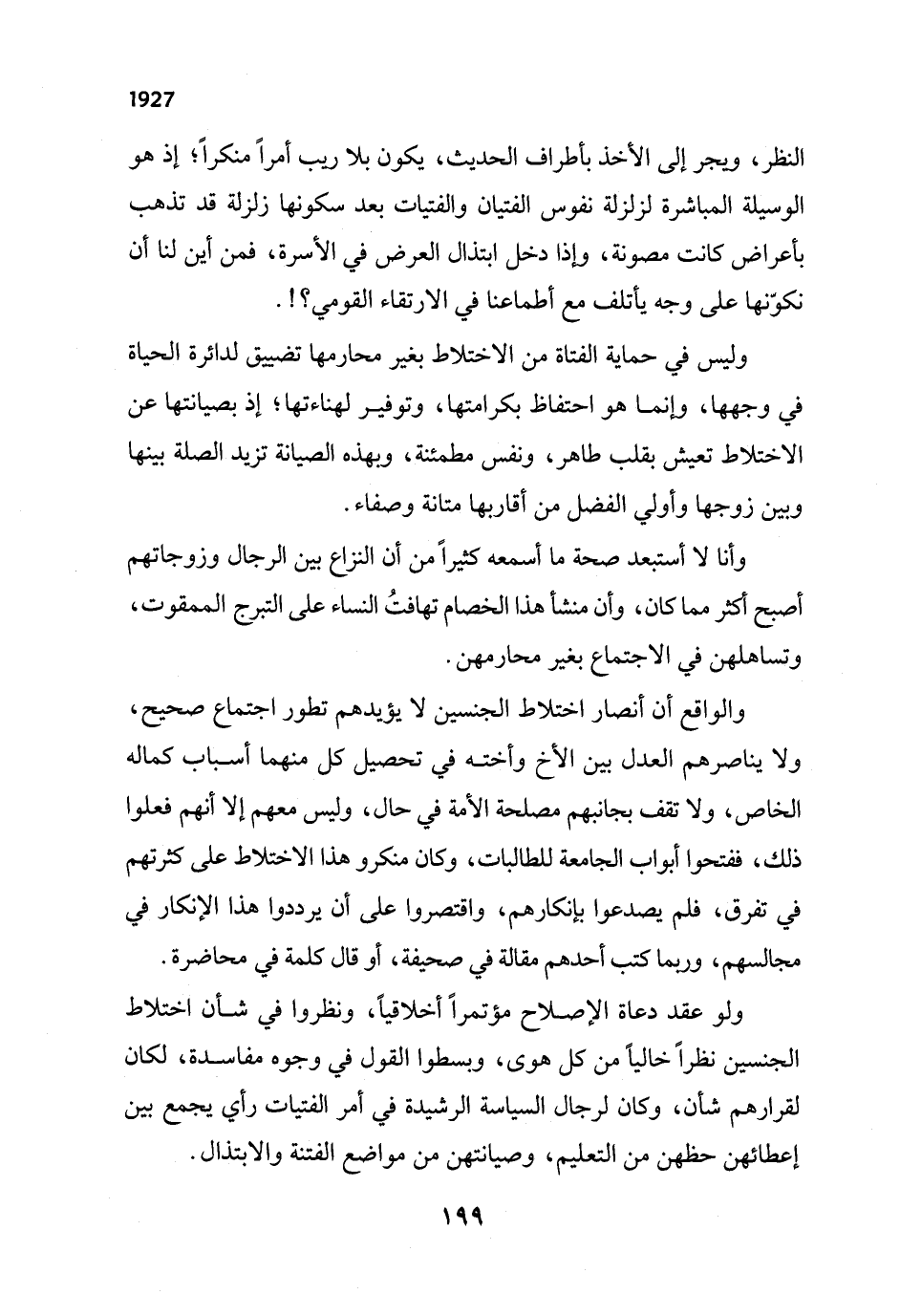 ولو عقد دعاة الإصلاح مؤتمراً أخلاقياً، ونظروا في شأن اختلاط الجنسين نظراً خالياً من كل هوى، وبسطوا القول في وجوه مفاسدة، لكان لقرارهم شأن، وكان لرجال السياسة الرشيدة في أمر الفتيات رأي يجمع بين إعطائهن حظهن من التعليم، وصيانتهن من مواضع الفتنة والابتذال.
