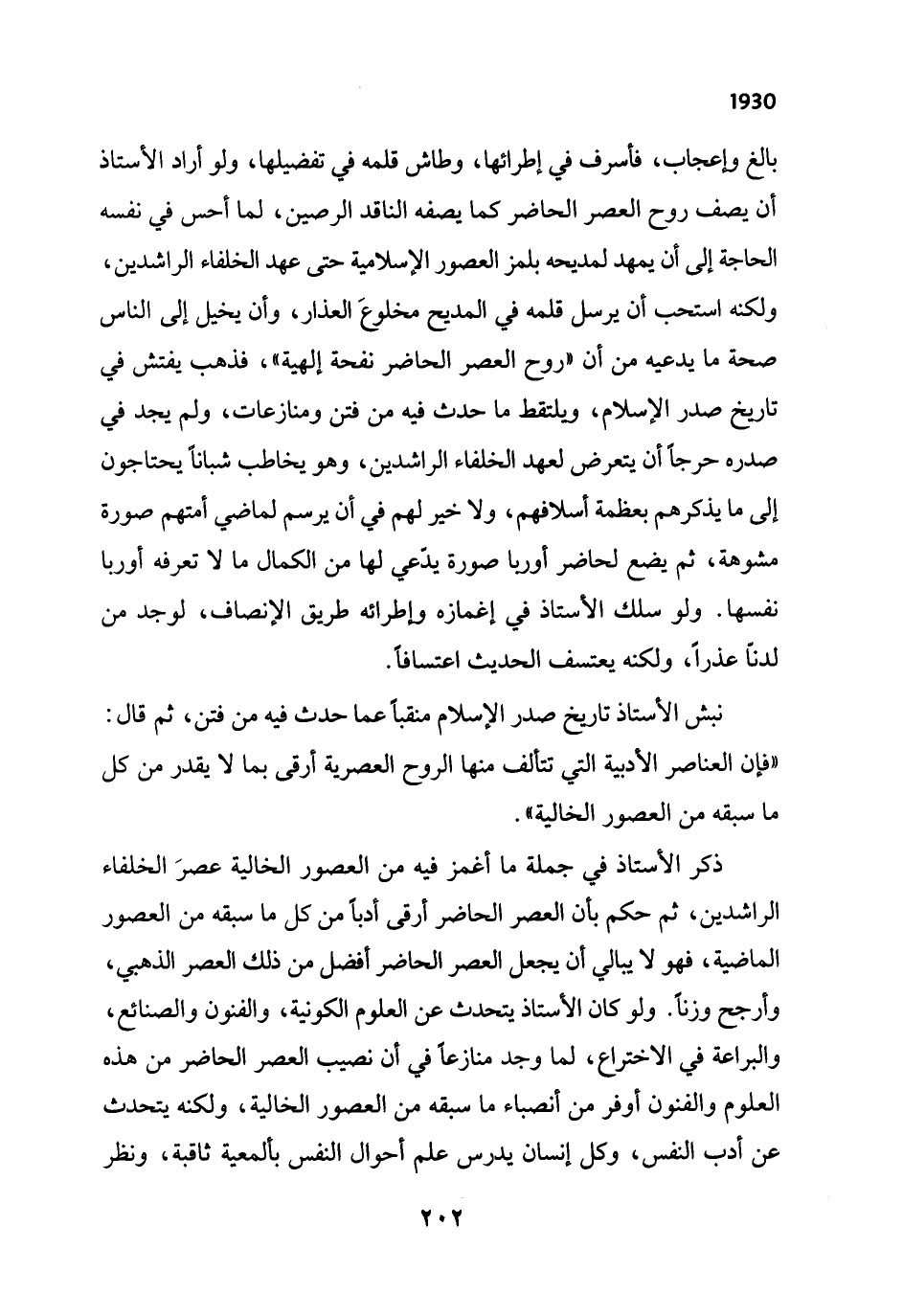 بالغ وإعجاب، فأسرف في إطرائها، وطاش قلمه في تفضيلها، ولو أراد الأستاذ أن يصف روح العصر الحاضر كما يصفه الناقد الرصين، لما أحس في نفسه الحاجة إلى أن يمهد لمديحه بلمز العصور الإسلامية حتى عهد الخلفاء الراشدين، ولكنه استحب أن يرسل قلمه في المديح مخلوعَ العذار، وأن يخيل إلى الناس صحة ما يدعيه من أن "روح العصر الحاضر نفحة إلهية"، فذهب يفتش في تاريخ صدر الإسلام، ويلتقط ما حدث فيه من فتن ومنازعات، ولم يجد في صدره حرجًا أن يتعرض لعهد الخلفاء الراشدين، وهو يخاطب شبانًا يحتاجون إلى ما يذكرهم بعظمة أسلافهم، ولا خير لهم في أن يرسم لماضي أمتهم صورة مشوهة، ثم يضع لحاضر أوربا صورة يدعي لها من الكمال ما لا تعرفه أوربا نفسها. ولو سلك الأستاذ في إغمازه وإطرائه طريق الإنصاف، لوجد من لدناّ عذراً، ولكنه يعتسف الحديث اعتسافاً.