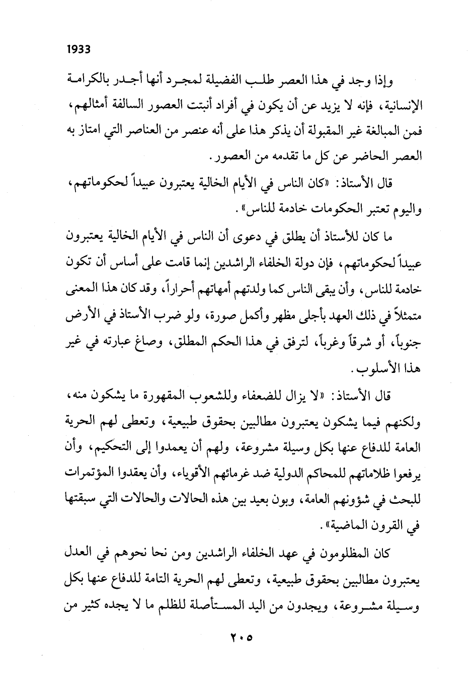 ما كان للأستاذ أن يطلق في دعوى أن الناس في الأيام الخالية يعتبرون عبيداً لحكوماتهم، فإن دولة الخلفاء الراشدين إنما قامت على أساس أن تكون خادمة للناس، وأن يبقى الناس كما ولدتهم أمهاتهم أحراراً، وقد كان هذا المعنى متمثلاً في ذلك العهد بأجلى مظهر وأكمل صورة، ولو ضرب الأستاذ في الأرض جنوبًا، أو شرقاً وغرباً، لترفق في هذا الحكم المطلق، وصاغ عبارته في غير هذا الأسلوب.