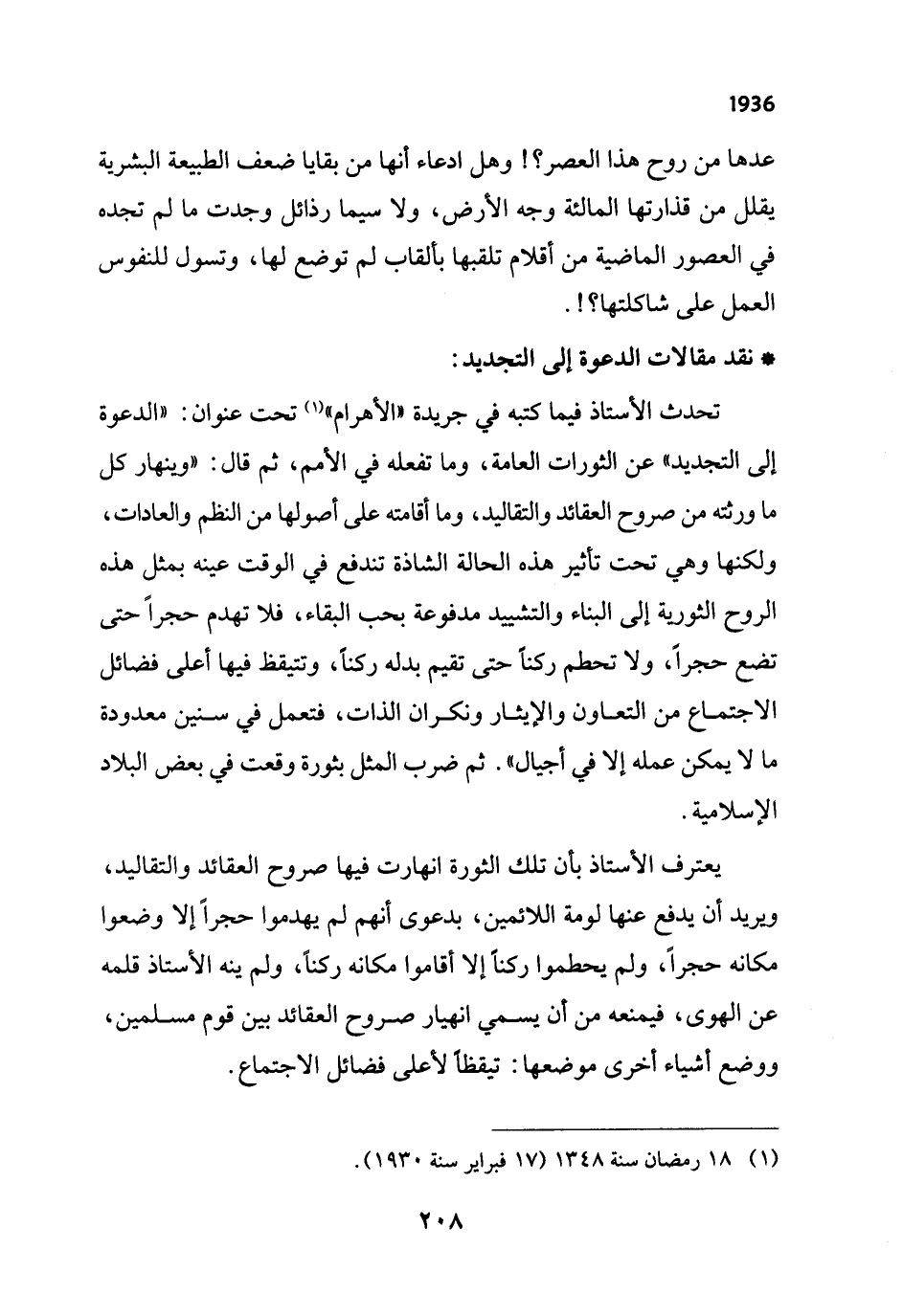 تحدث الأستاذ فيما كتبه في جريدة "الأهرام" (¬1) تحت عنوان: "الدعوة إلى التجديد" عن الثورات العامة، وما تفعله في الأمم، ثم قال: "وينهار كل ما ورثته من صروح العقائد والتقاليد، وما أقامته على أصولها من النظم والعادات، ولكنها وهي تحت تاثير هذه الحالة الشاذة تندفع في الوقت عينه بمثل هذه الروح الثوربة إلى البناء والتشييد مدفوعة بحب البقاء، فلا تهدم حجراً حتى تضع حجرًا، ولا تحطم ركنًا حتى تقيم بدله ركنًا، وتتيقظ فيها أعلى فضائل الاجتماع من التعاون والإيثار ونكران الذات، فتعمل في سنين معدودة ما لا يمكن عمله إلا في أجيال". ثم ضرب المثل بثورة وقعت في بعض البلاد الإسلامية.