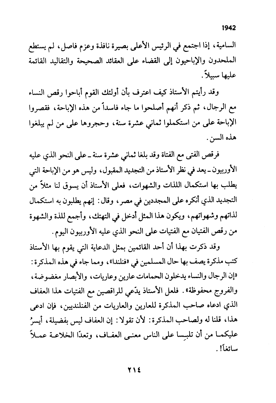 وقد رأيتم الأستاذ كيف اعترف بأن أولئك القوم أباحوا رقص النساء مع الرجال، ثم ذكر أنهم أصلحوا ما جاء فاسداً من هذه الإباحة، فقصروا الإباحة على من استكملوا ثماني عشرة سنة، وحجروها على من لم يبلغوا هذه السن.