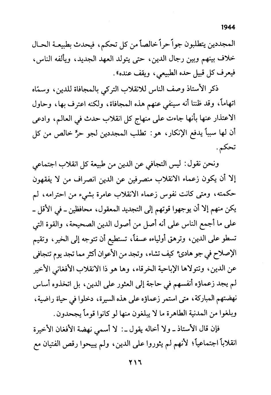 ونحن نقول: ليس التجافي عن الدين من طبيعة كل انقلاب اجتماعي إلا أن يكون زعماء الانقلاب منصرفين عن الدين انصراف من لا يفقهون حكمته، ومتى كانت نفوس زعماء الانقلاب عامرة بشيء من احترامه، لم يكن منهم إلا أن يوجهوا قوتهم إلى التجديد المعقول، محافظين - في الأقل - على ما أجمع الناس على أنه أصل من أصول الدين الصحيحة، والقوة التي تسطو على الدين، وترهق أولياءه عسفاً، تستطيع أن تتوجه إلى الخير، وتقيم الإصلاح في جو هادئ كيف تشاء، وتجد من الأعوان أكثر مما تجد يوم تتجافى عن الدين، وتتولاها الإباحية الخرقاء، وها هو ذا الانقلاب الأفغاني الأخير لم يجد زعماؤه أنفسهم في حاجة إلى العثور على الدين، بل اتخذوه أساس نهضتهم المباركة، متى استمر زعماؤه على هذه السيرة، دخلوا في حياة راضية، وبلغوا من المدنية الطاهرة ما لا يبلغون منها لو كانوا قوماً يجحدون.